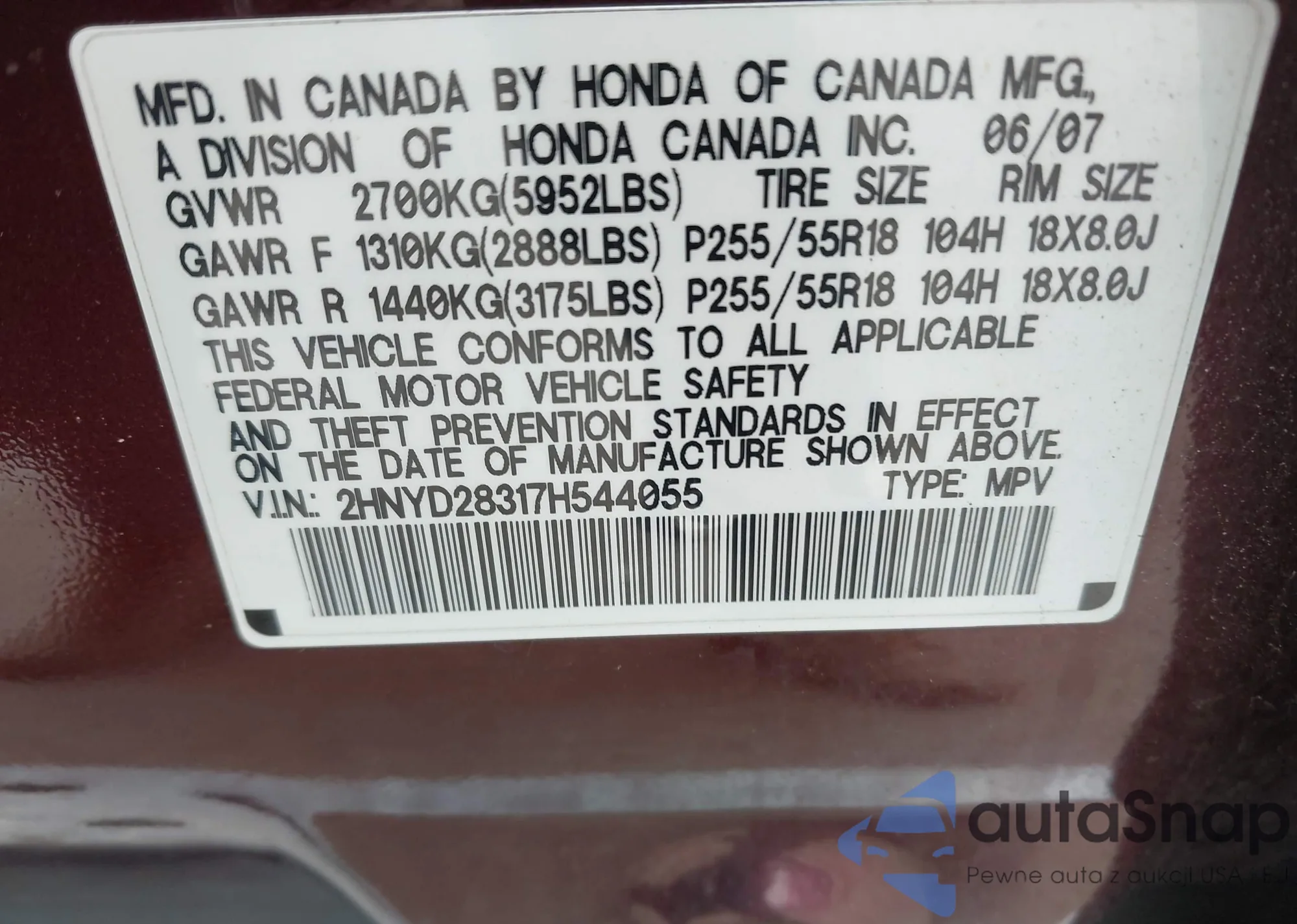 • VIN 2HNYD28317H544055