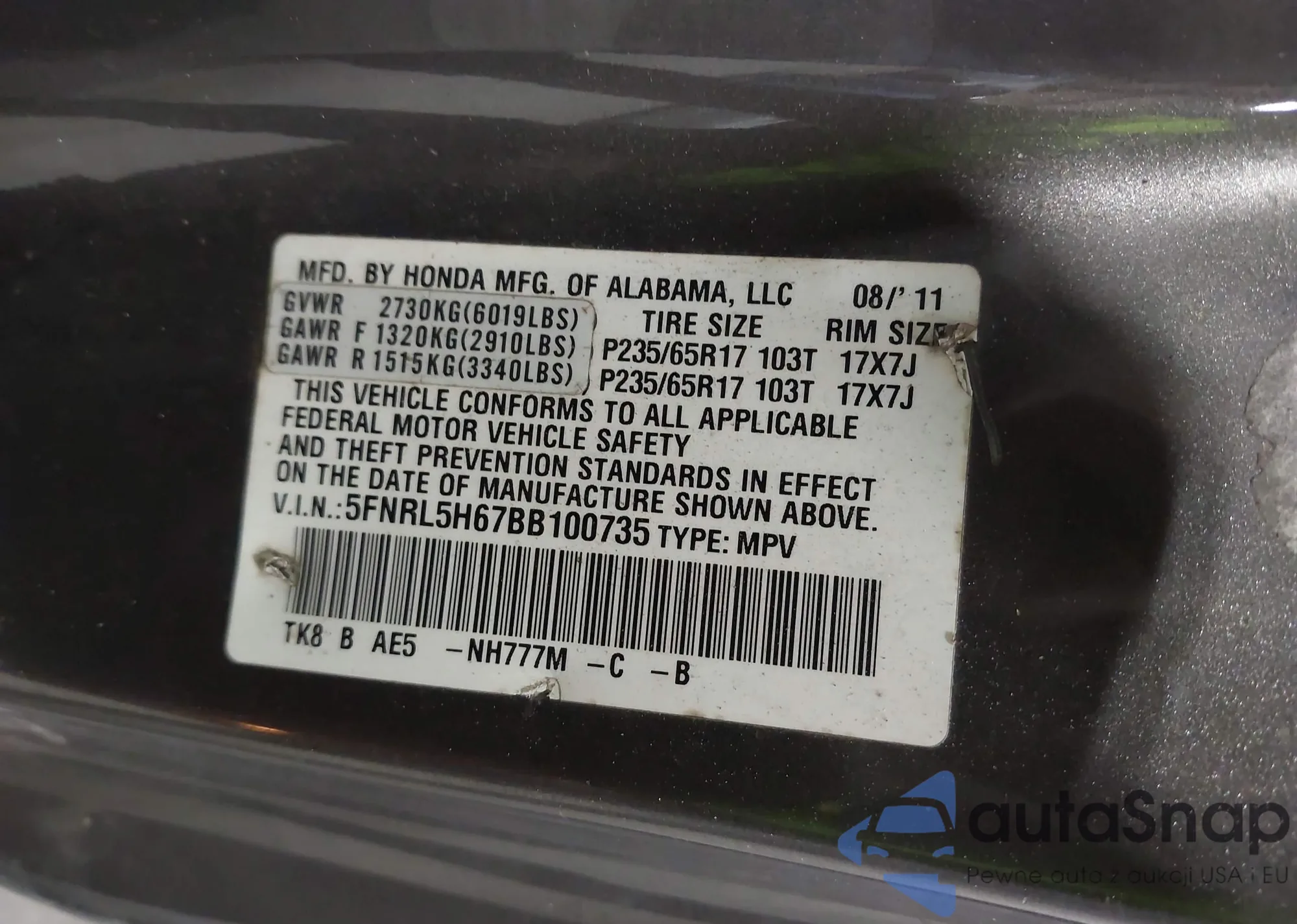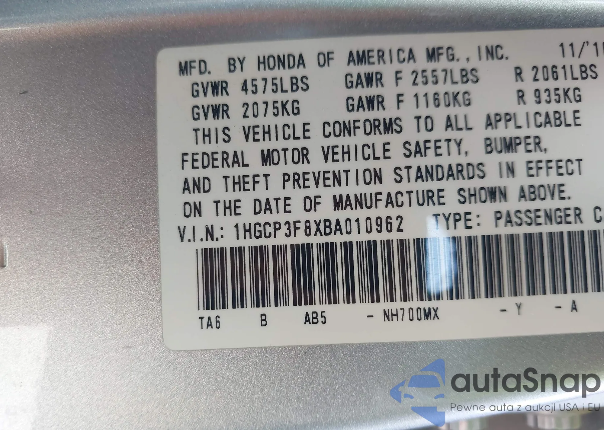 LOT: 42467656 VIN: 1HGCP3F8XBA010962