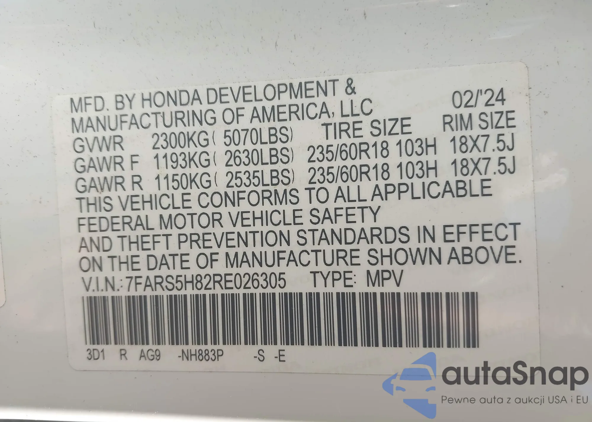 • VIN 7FARS5H82RE026305