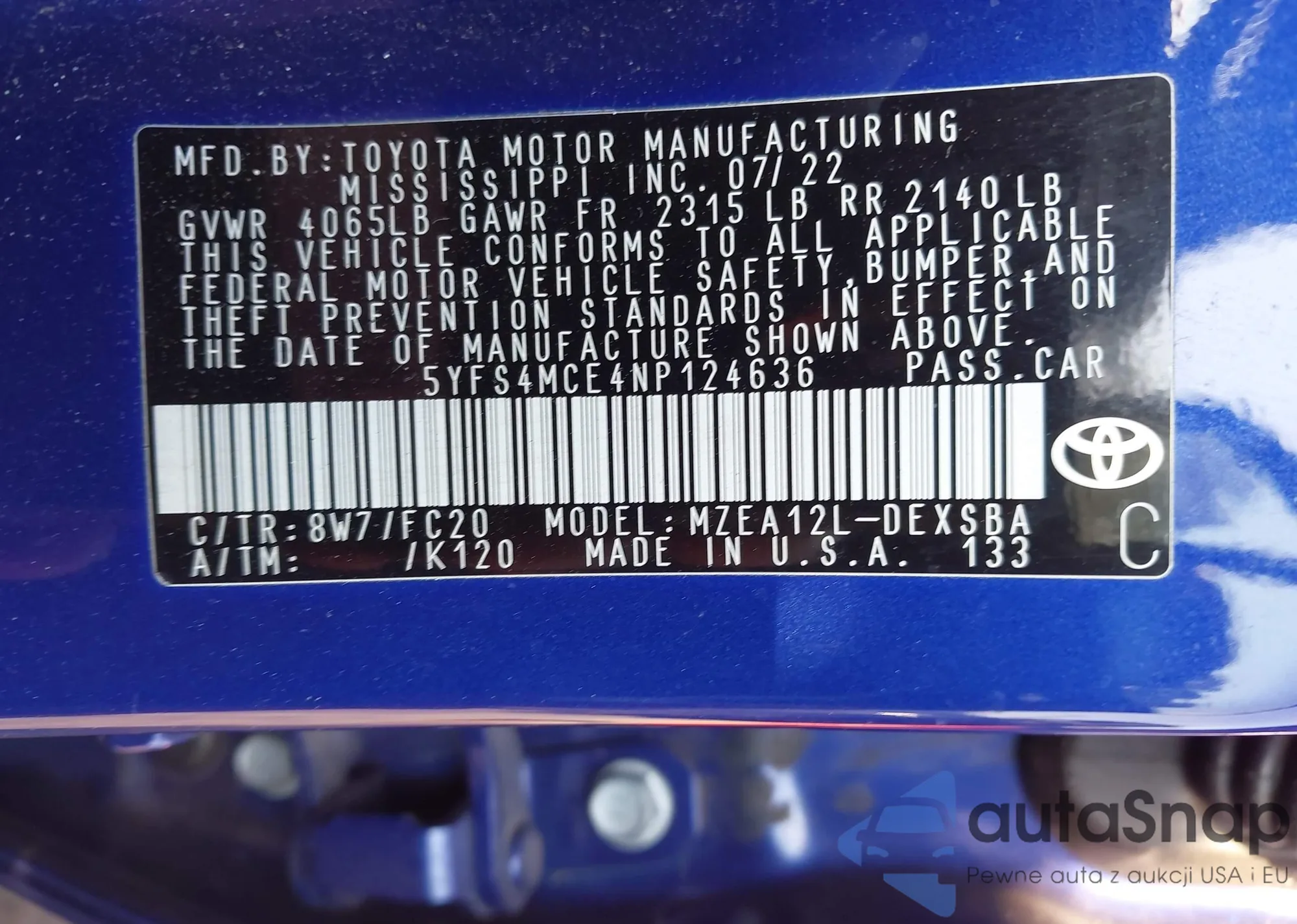 • VIN 5YFS4MCE4NP124636