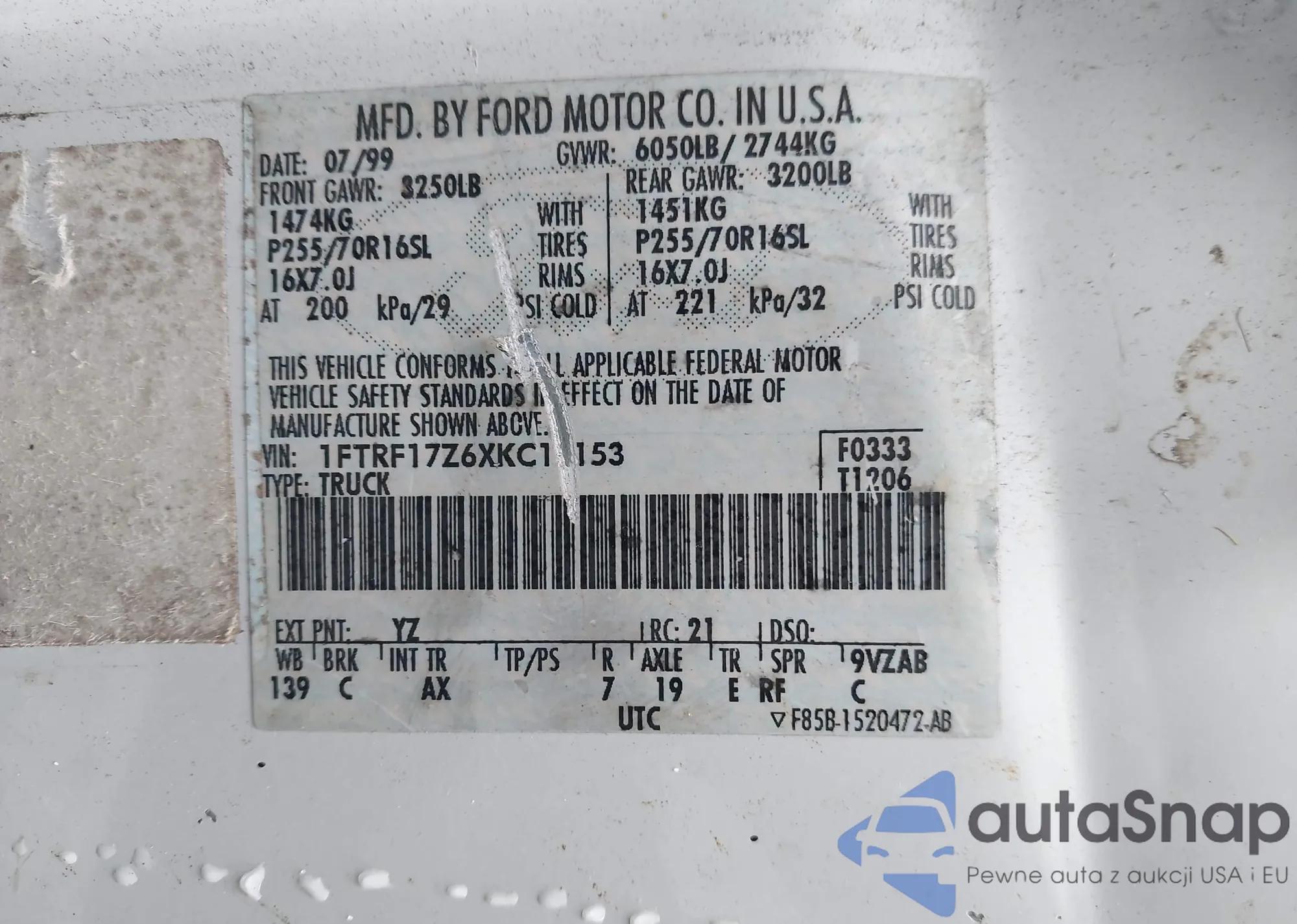 LOT: 43550262 VIN: 1FTRF17Z6XKC11153
