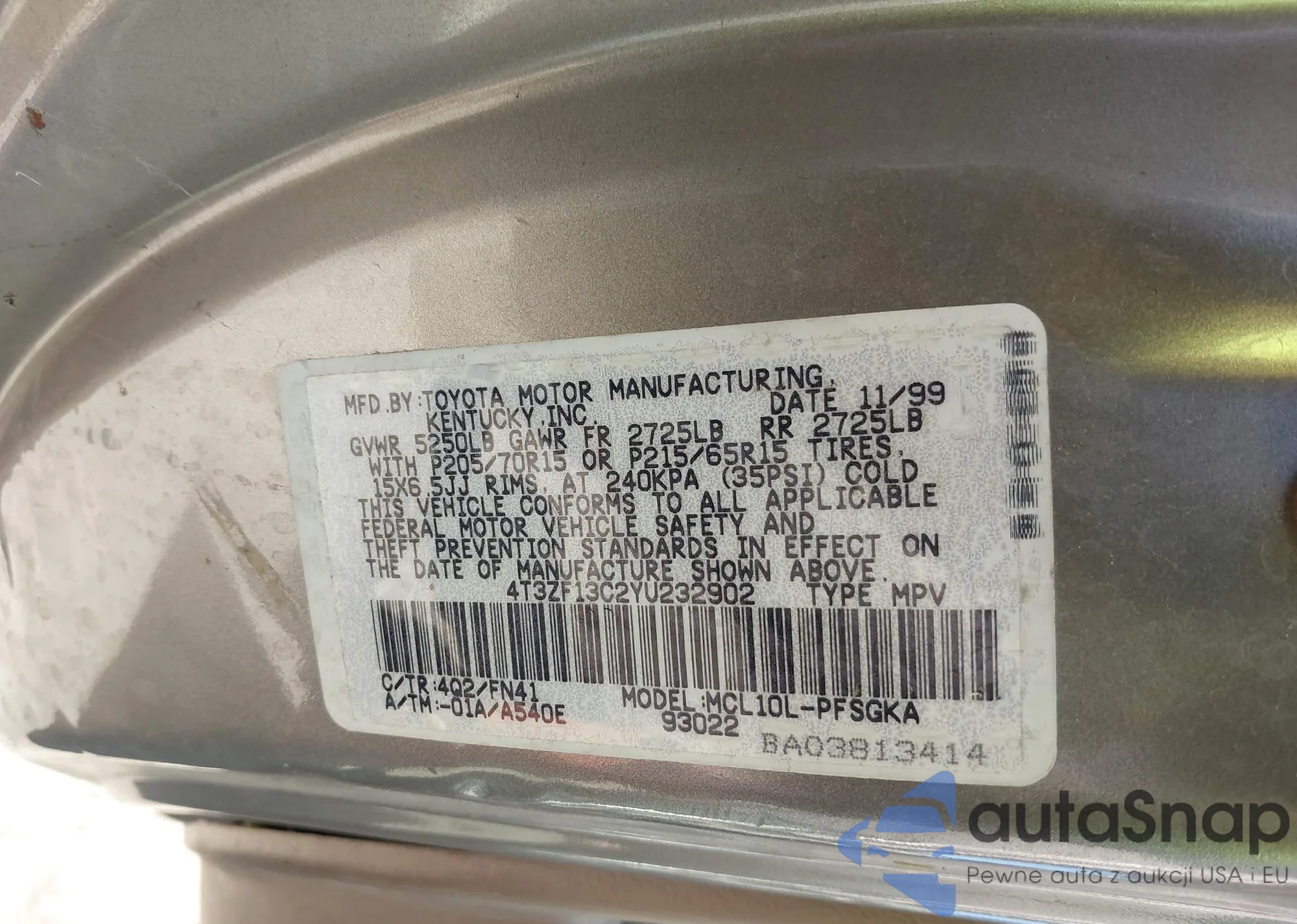 LOT: 43416076 VIN: 4T3ZF13C2YU232902