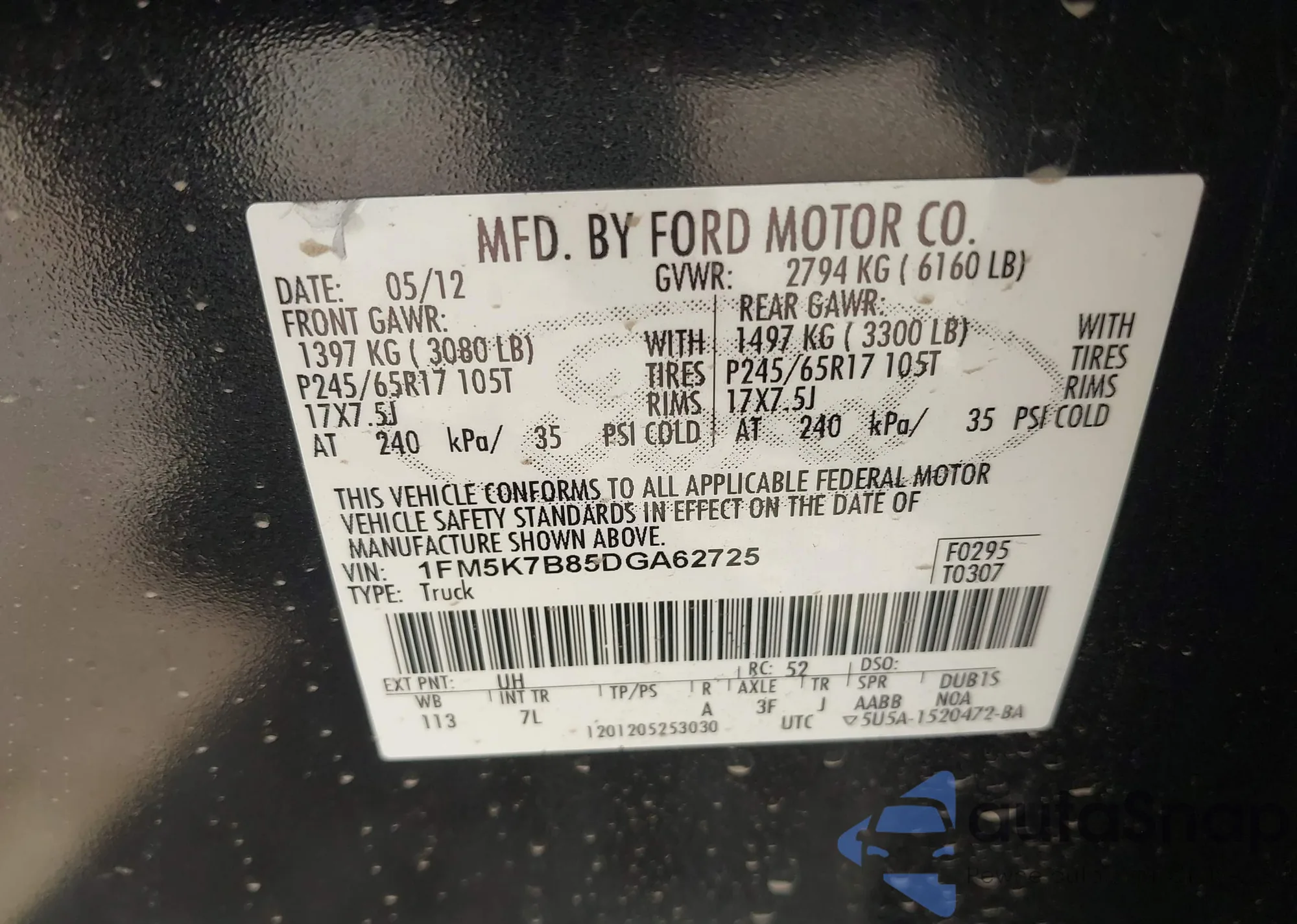 LOT: 43538785 VIN: 1FTRW07L33KD83723