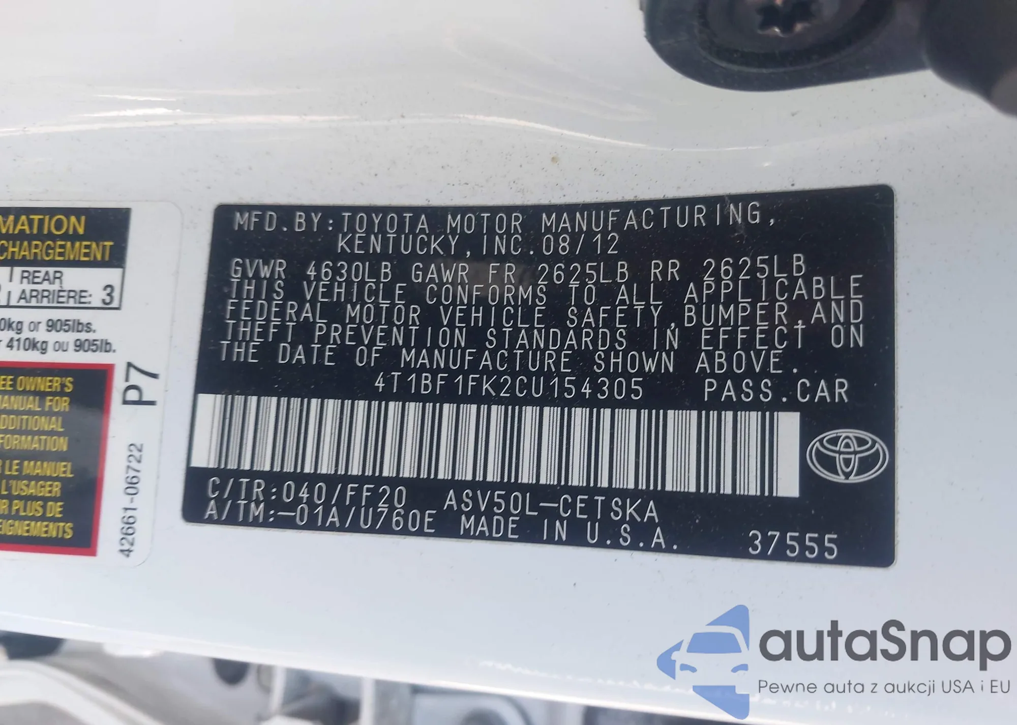 • VIN 4T1BF1FK2CU154305