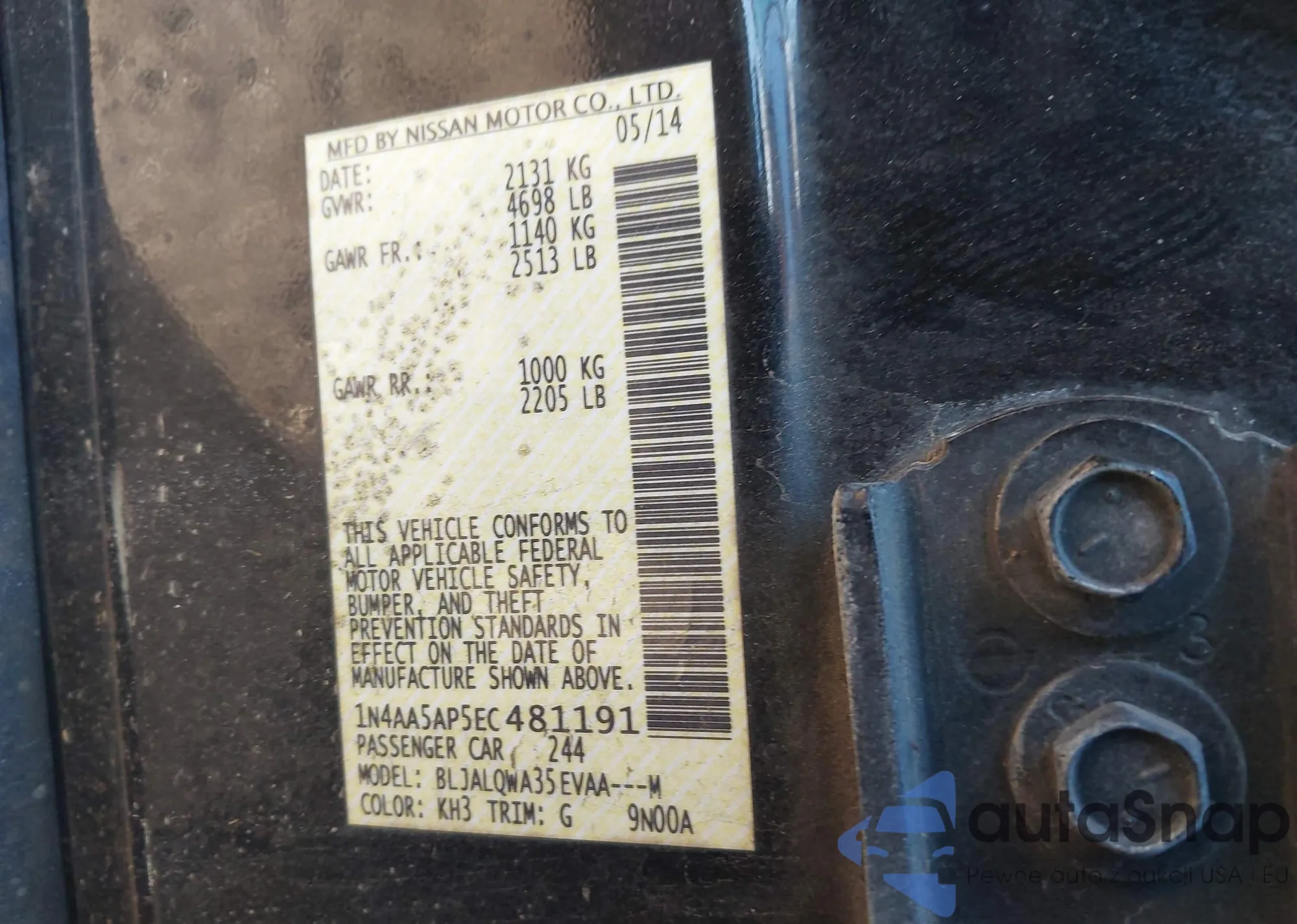 • VIN 1N4BL4BV7KC249421