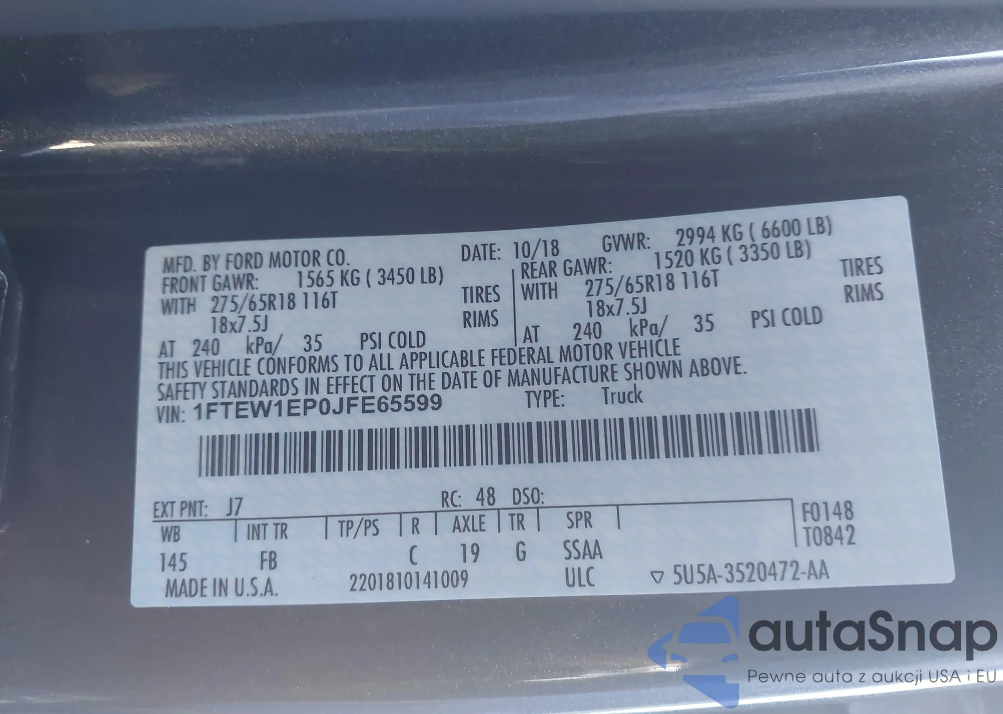 LOT: 43723498 VIN: 1FTEW1EP0JFE65599