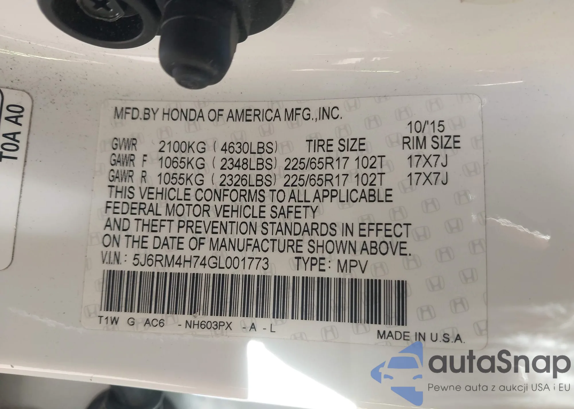 • VIN 5J6RM4H74GL001773