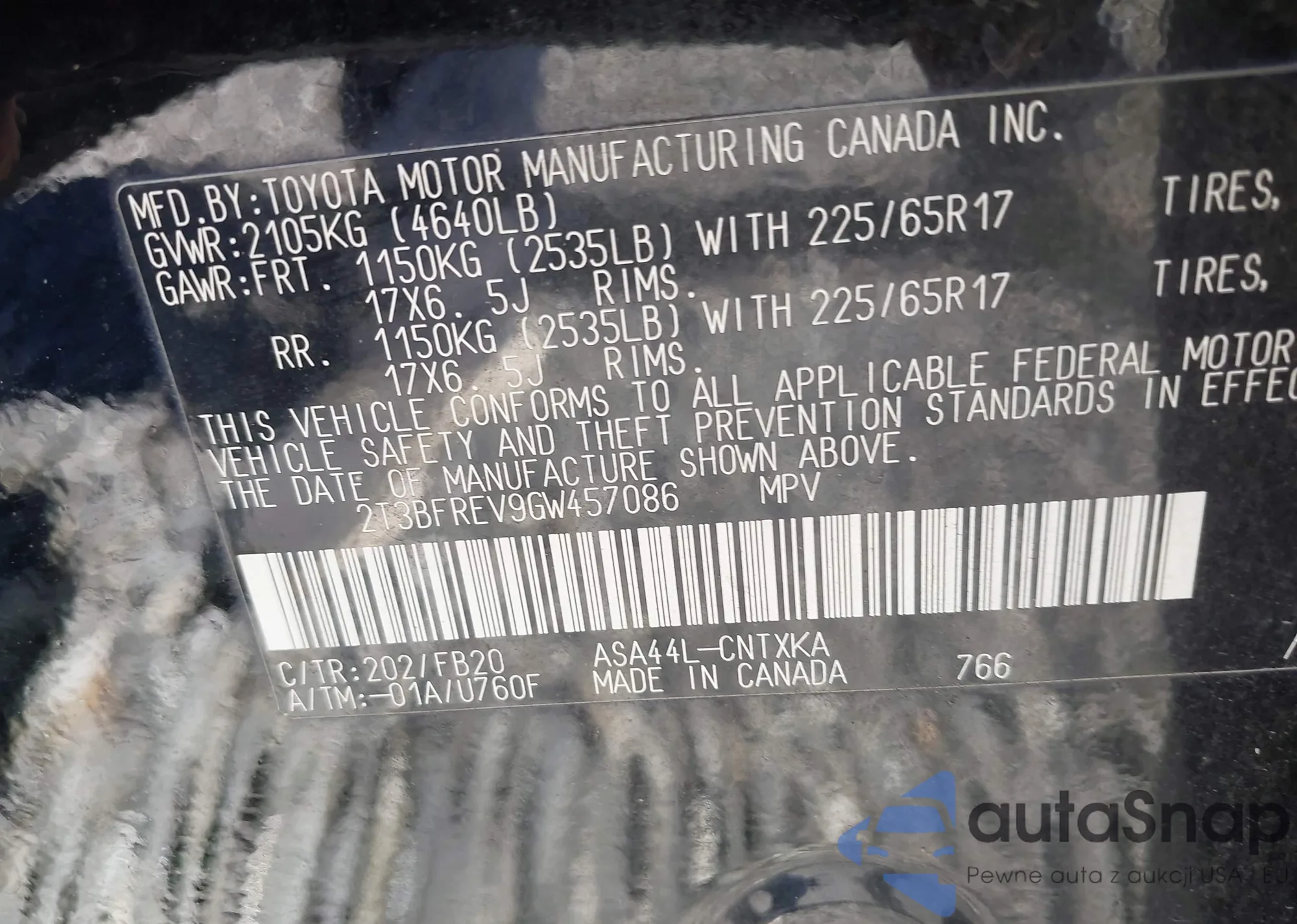 LOT: 43509359 VIN: 2T3BFREV9GW457086