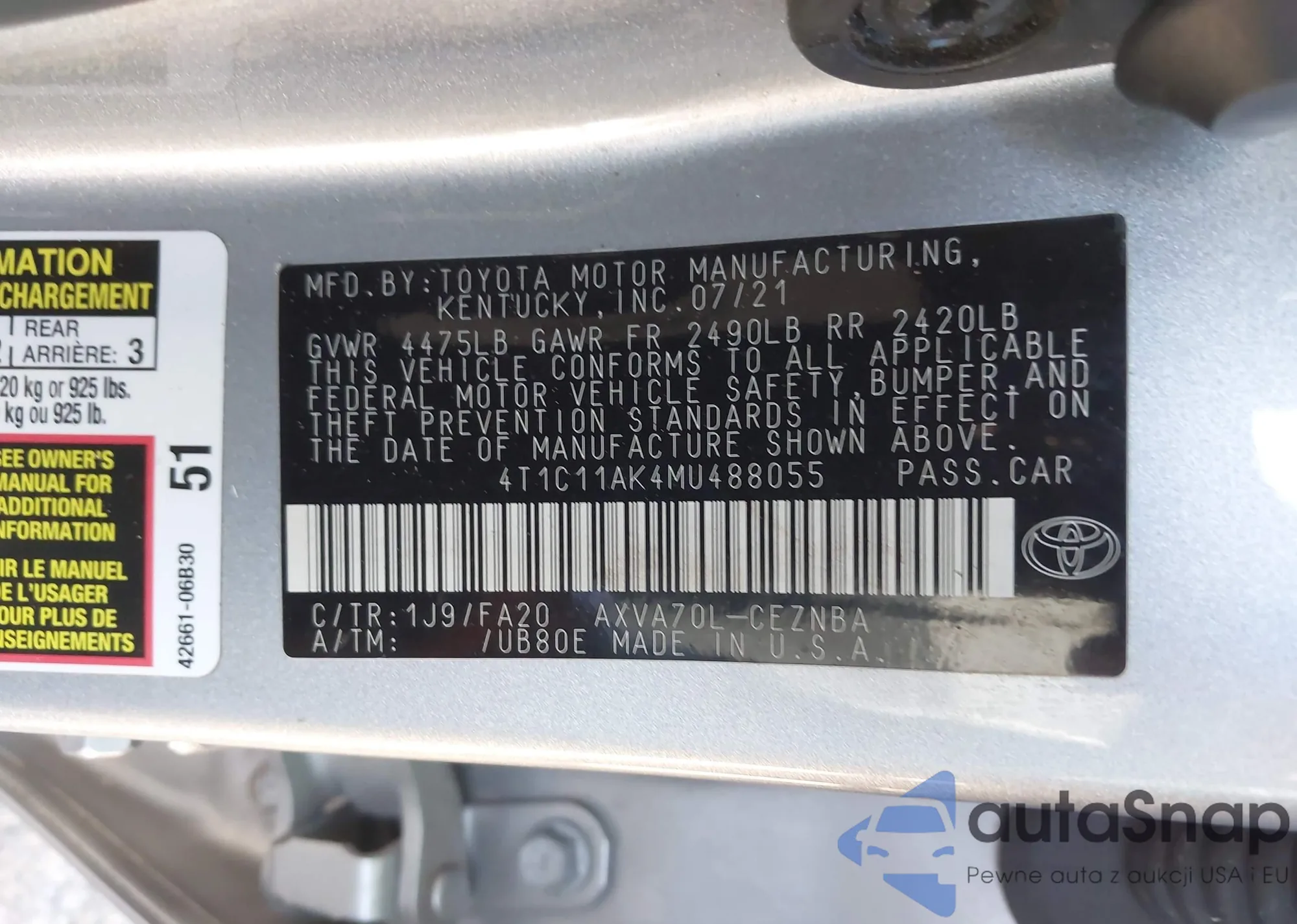LOT: 43633893 VIN: 4T1C11AK4MU488055
