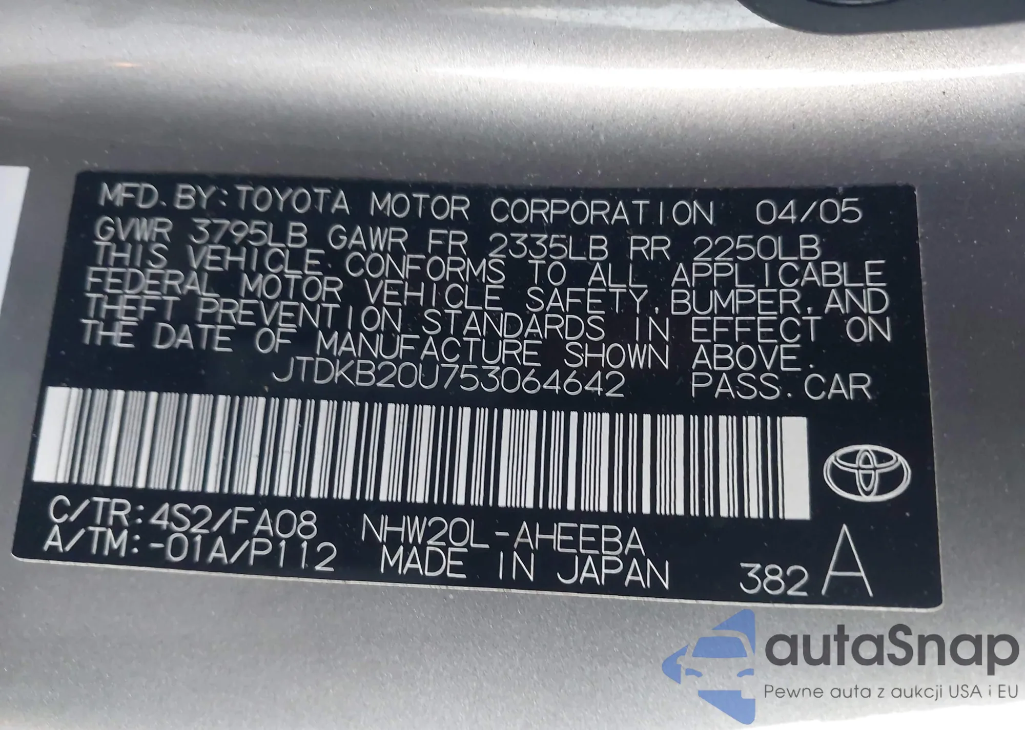 LOT: 43857721 VIN: JTDKB20U753064642