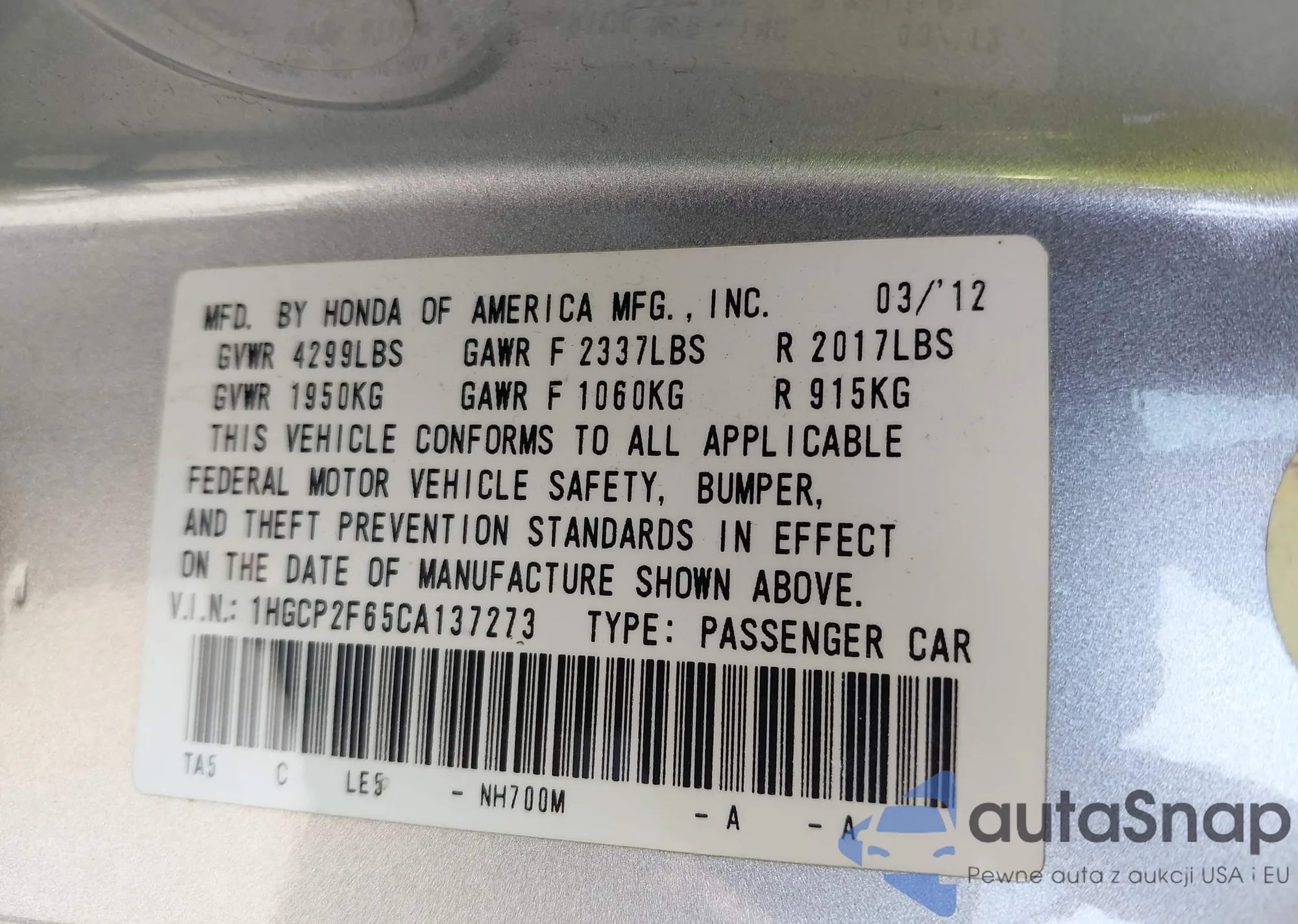 • VIN 1HGCP2F65CA137273