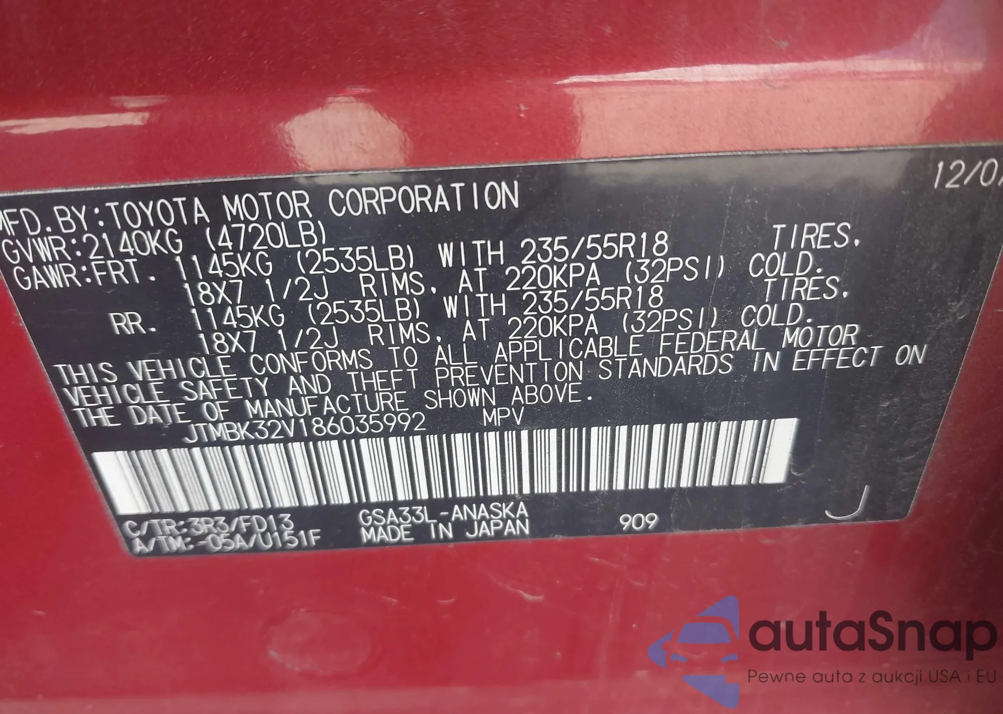 LOT: 43409385 VIN: JTMBK32V186035992
