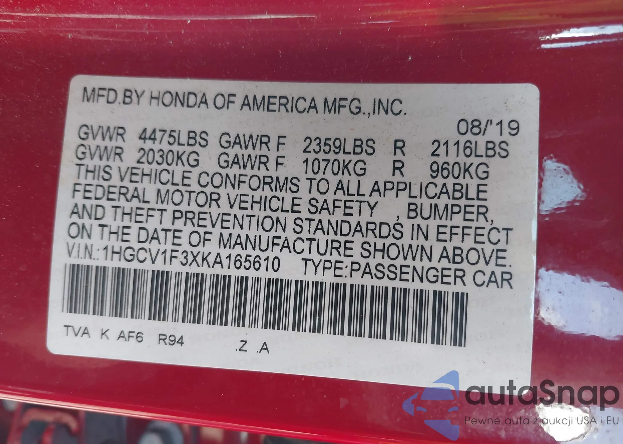 LOT: 41917857 VIN: 1HGCV1F3XKA165610