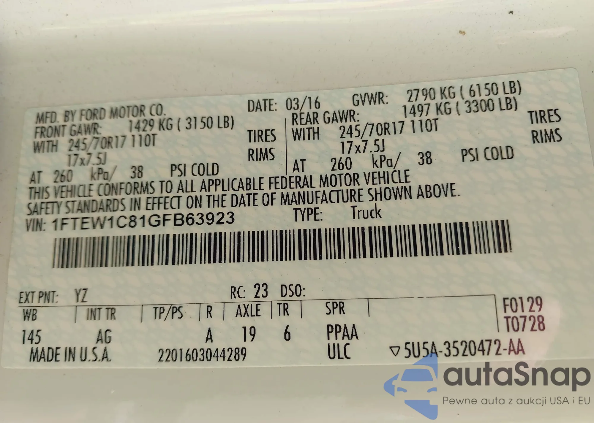 LOT: 43194555 VIN: 1FTEW1C81GFB63923