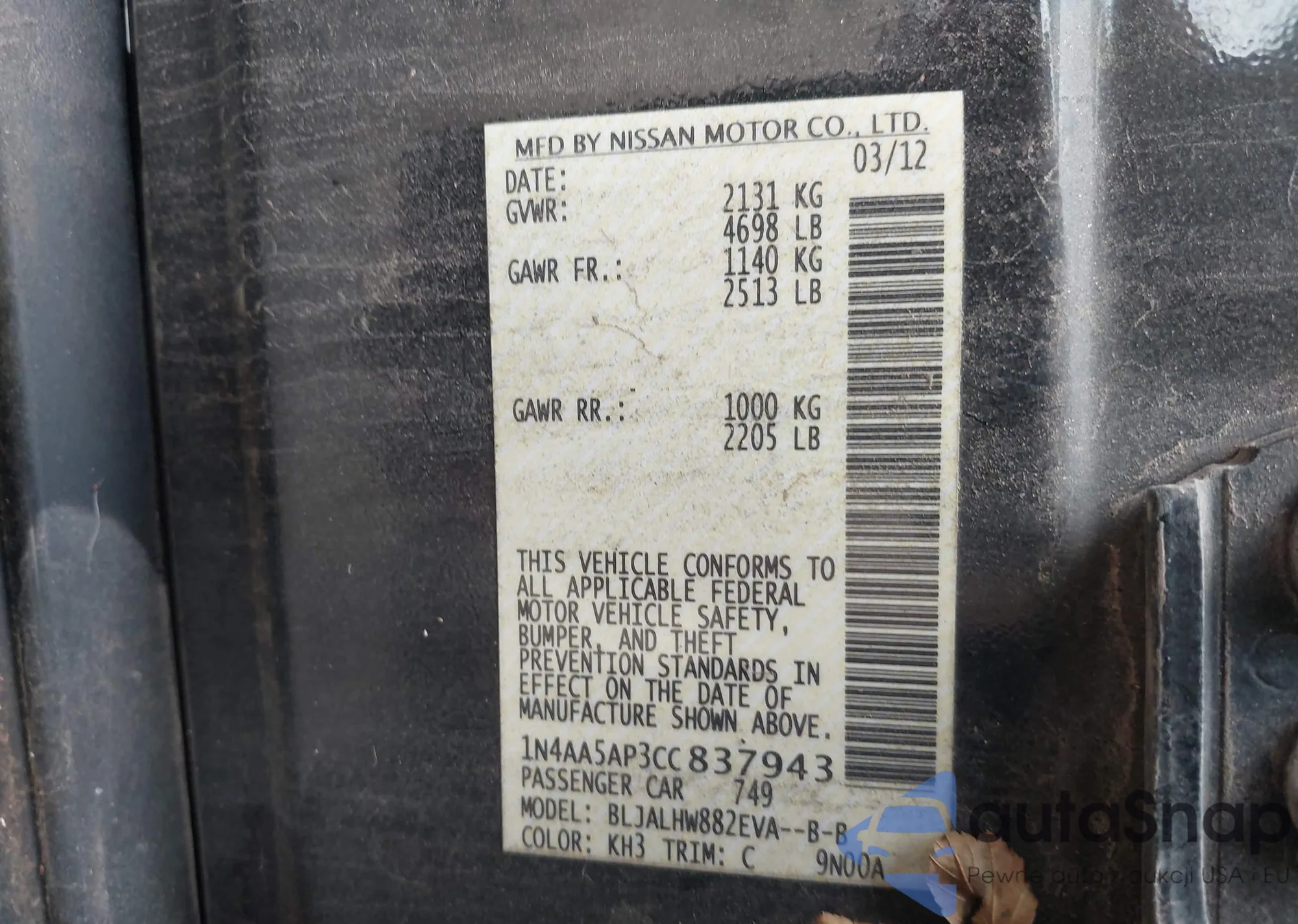 LOT: 43766255 VIN: 1N4AA5AP3CC837943