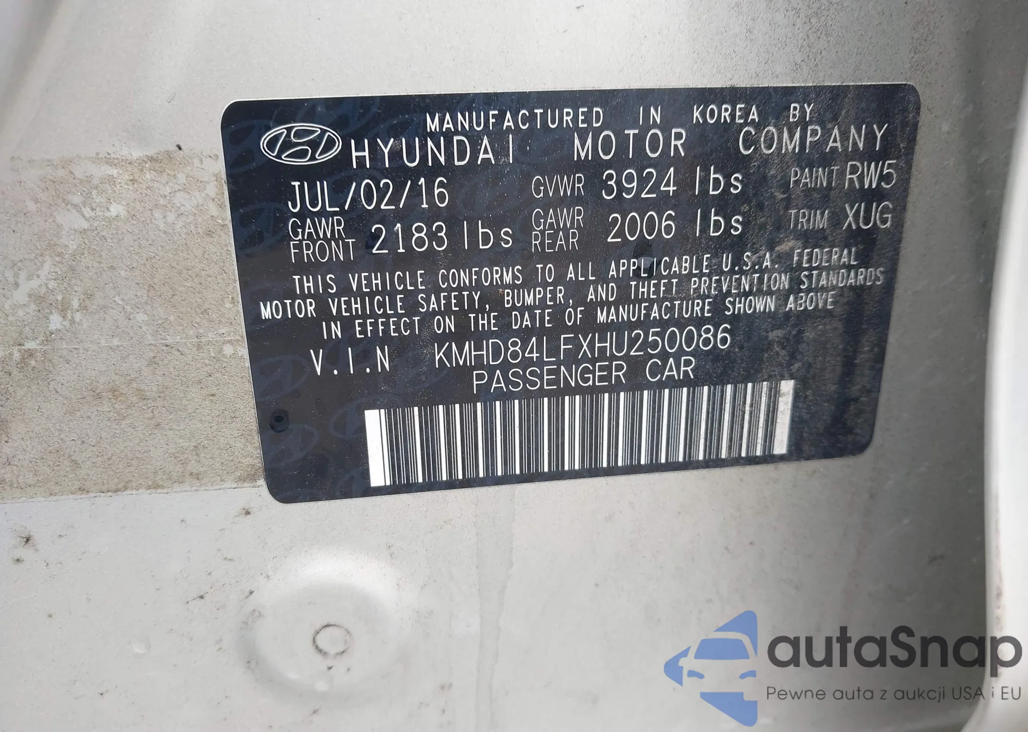 LOT: 43391667 VIN: KMHD84LFXHU250086