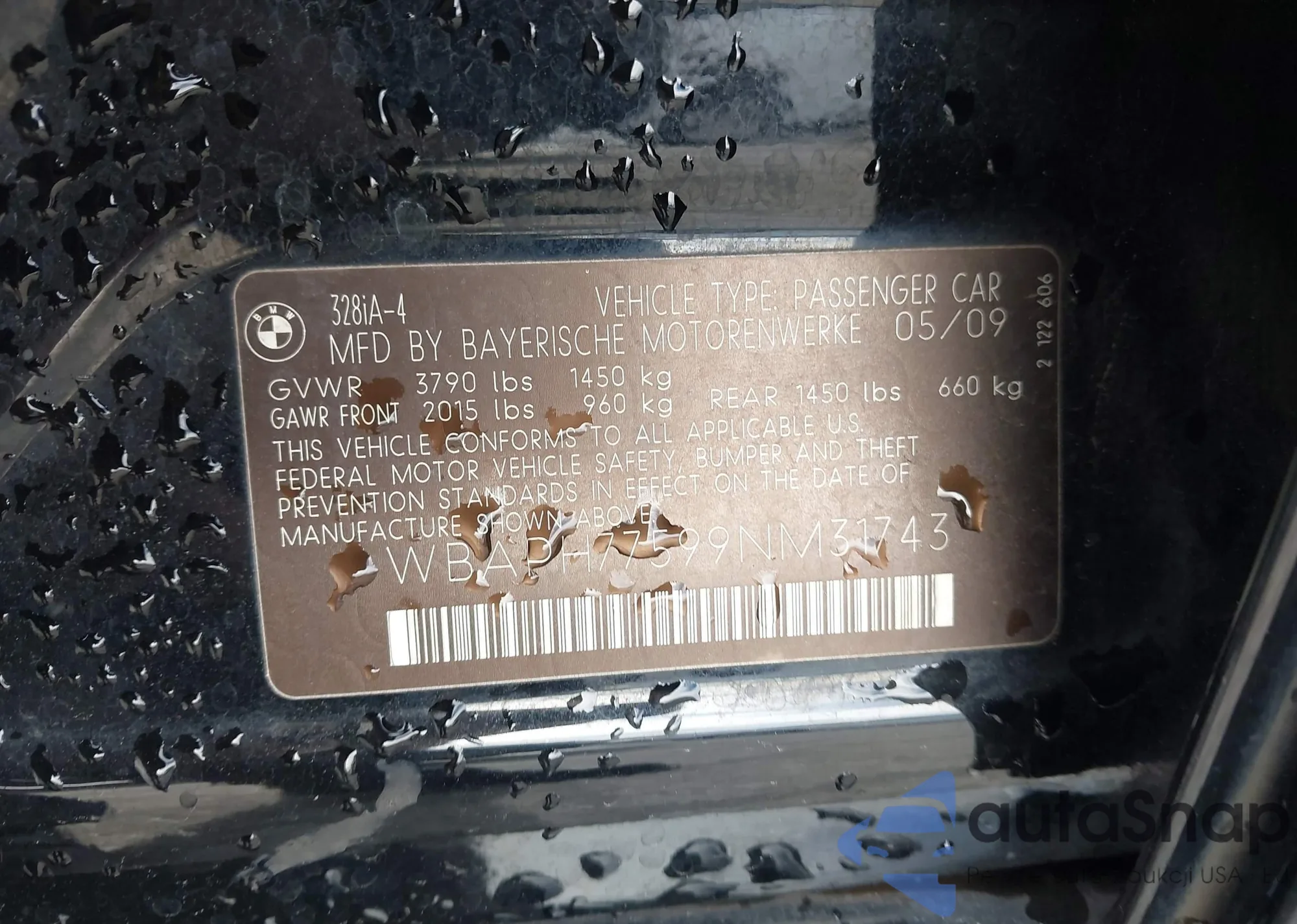 LOT: 43452380 VIN: WBAPH77599NM31743