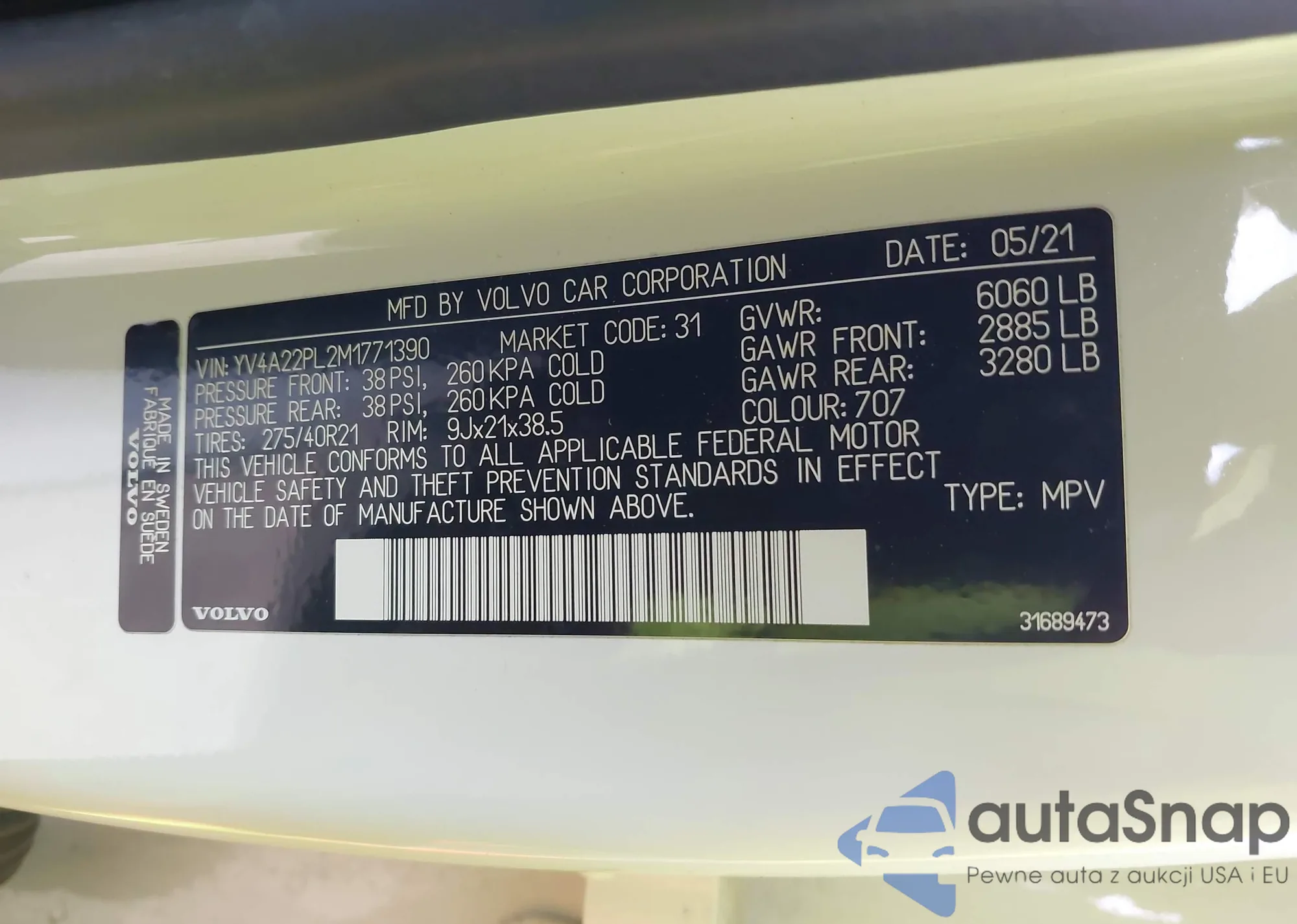 LOT: 40707064 VIN: YV4A22PL2M1771390