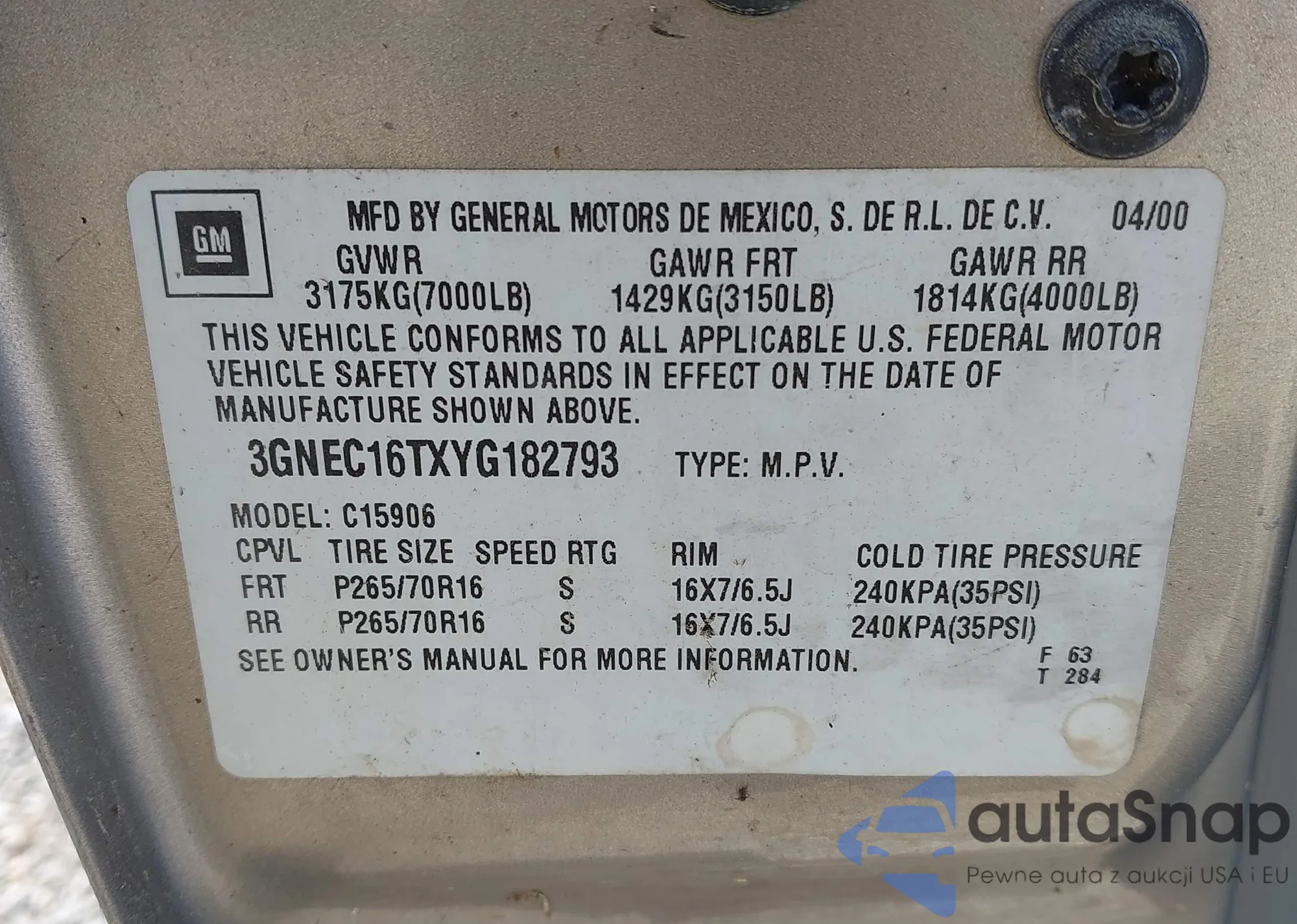 • VIN 3GNEC16TXYG182793