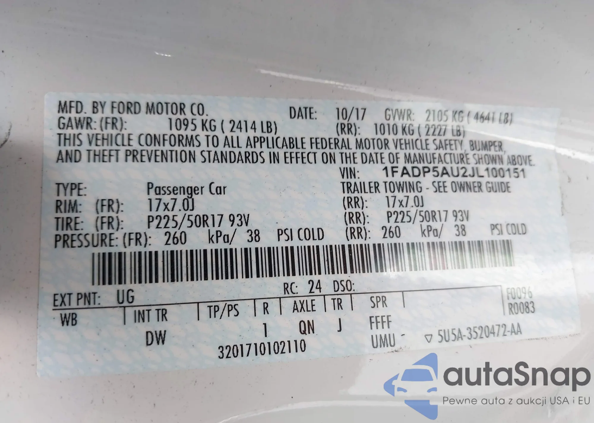 LOT: 43122550 VIN: 1FADP5AU2JL100151