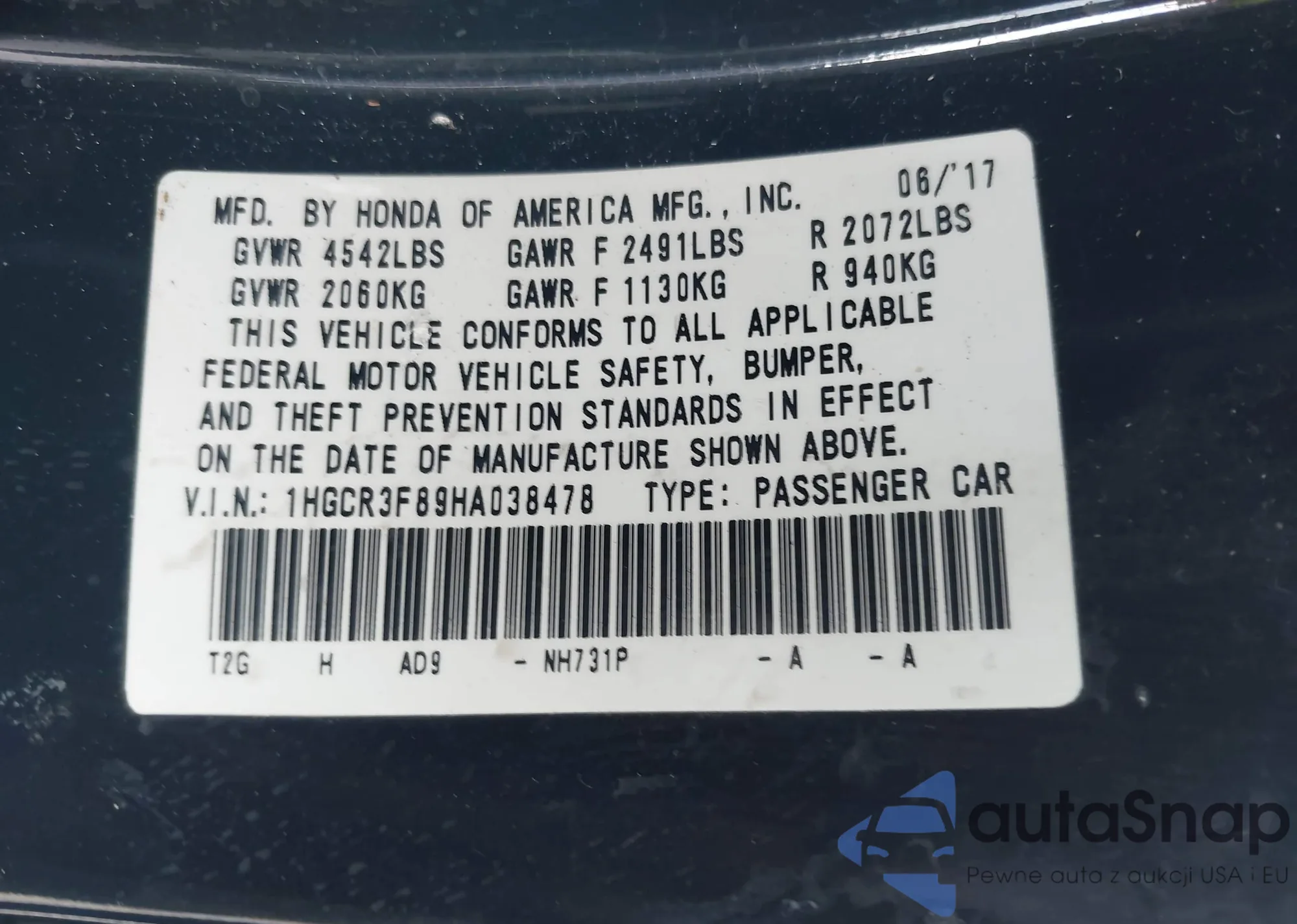 LOT: 43525994 VIN: 1HGCR3F89HA038478