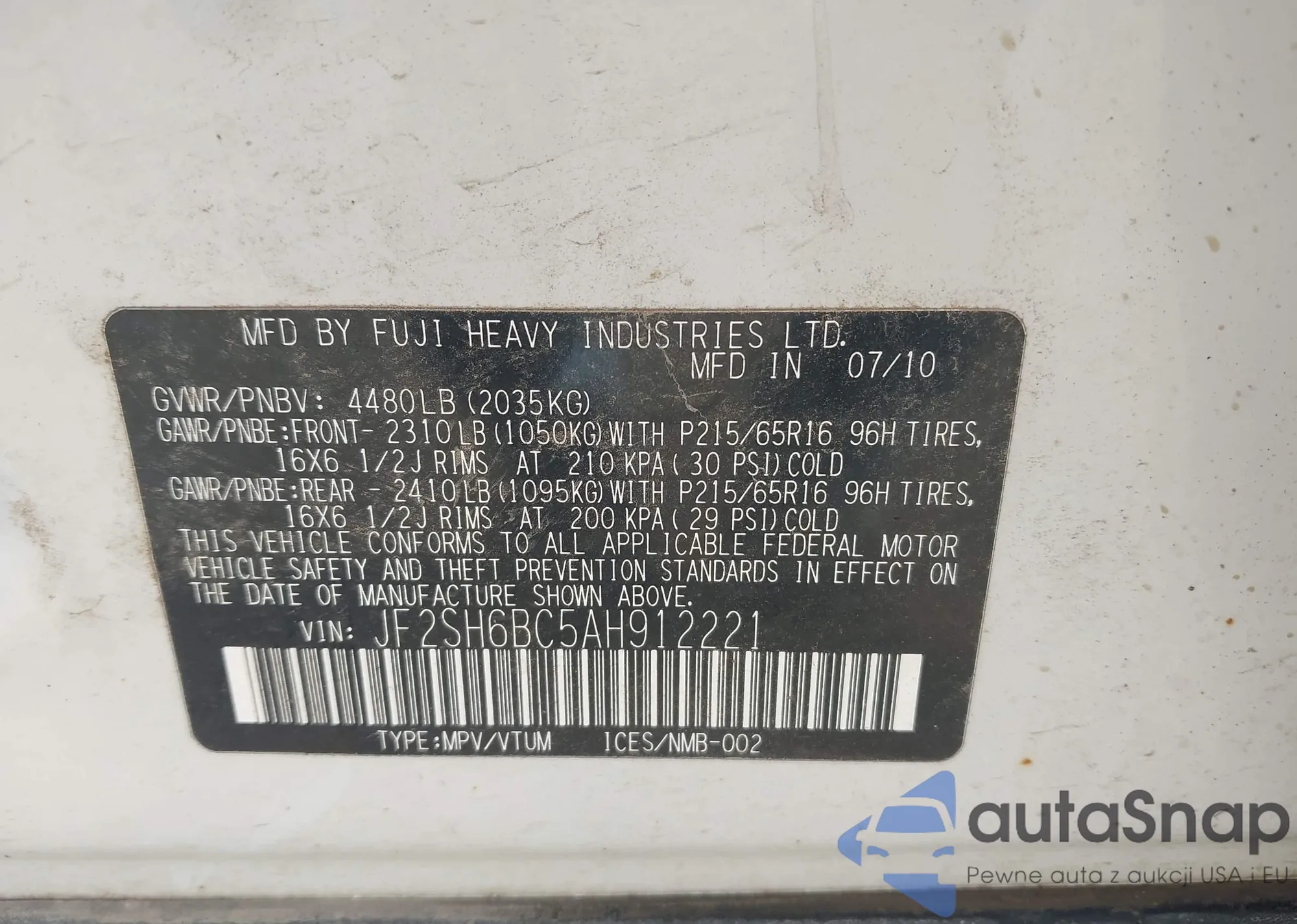 • VIN JF2SH6BC5AH912221