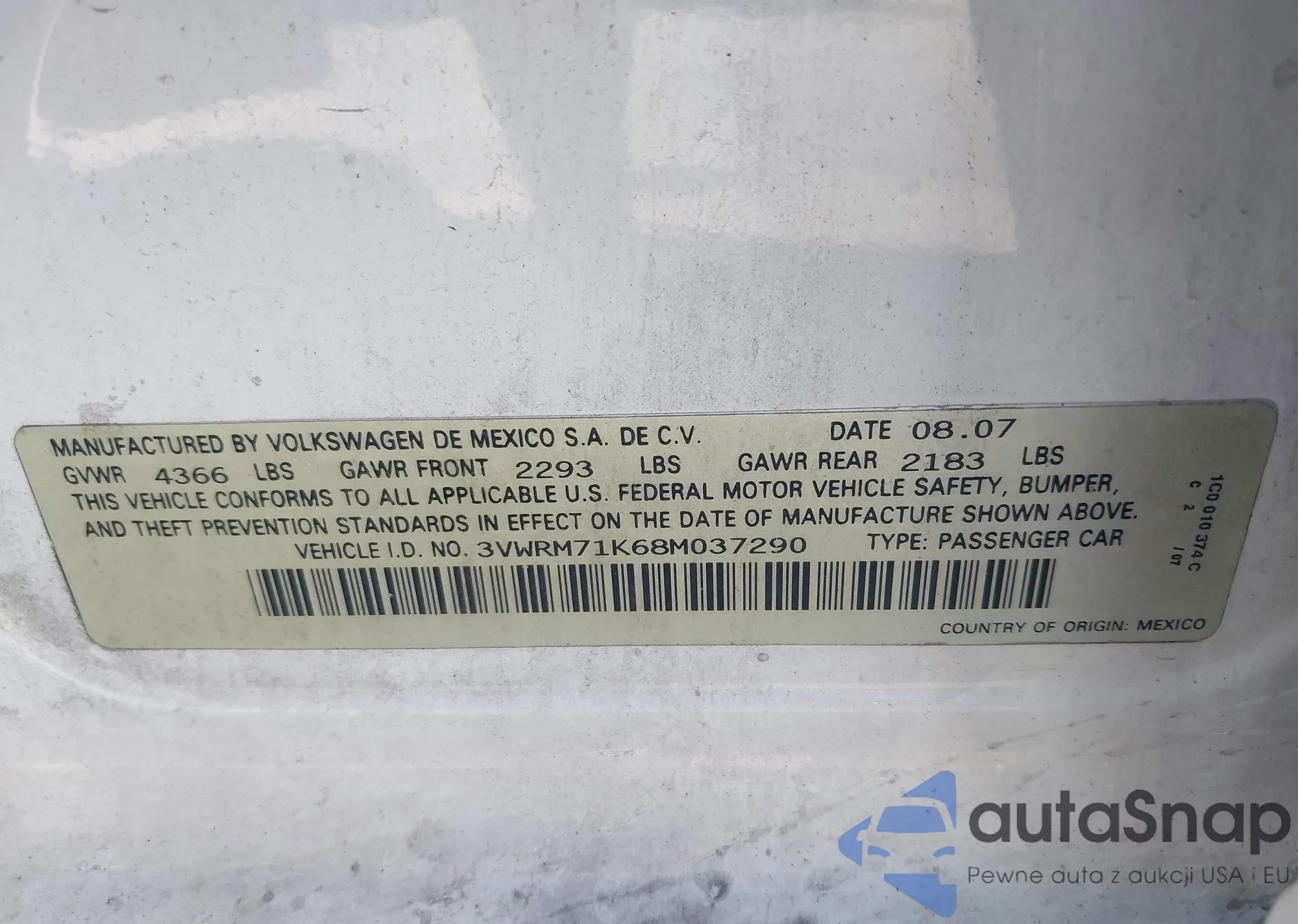 • VIN 3VWRM71K68M037290