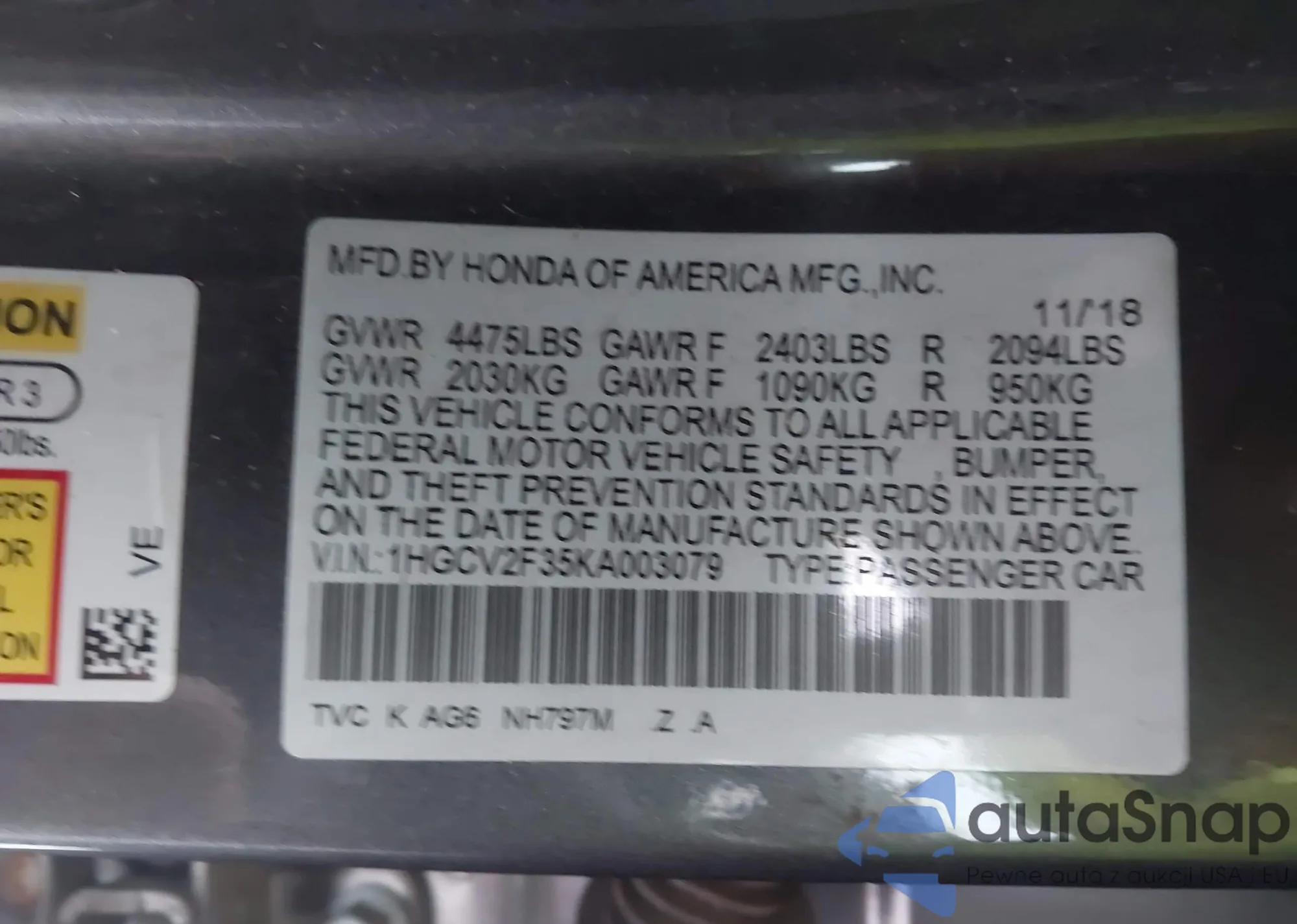 LOT: 43661511 VIN: 1HGCV2F35KA003079