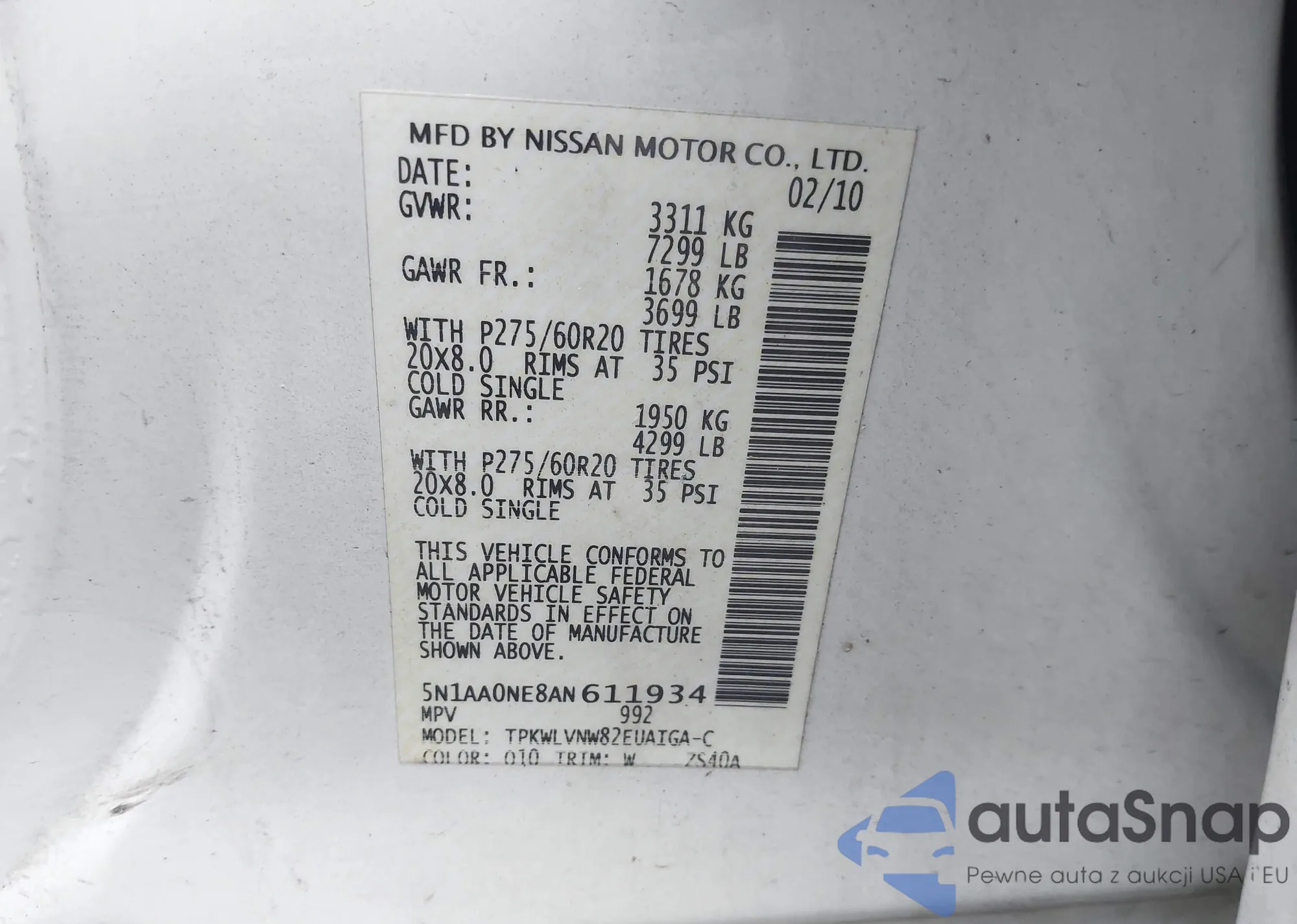 • VIN 5N1AA0NE8AN611934