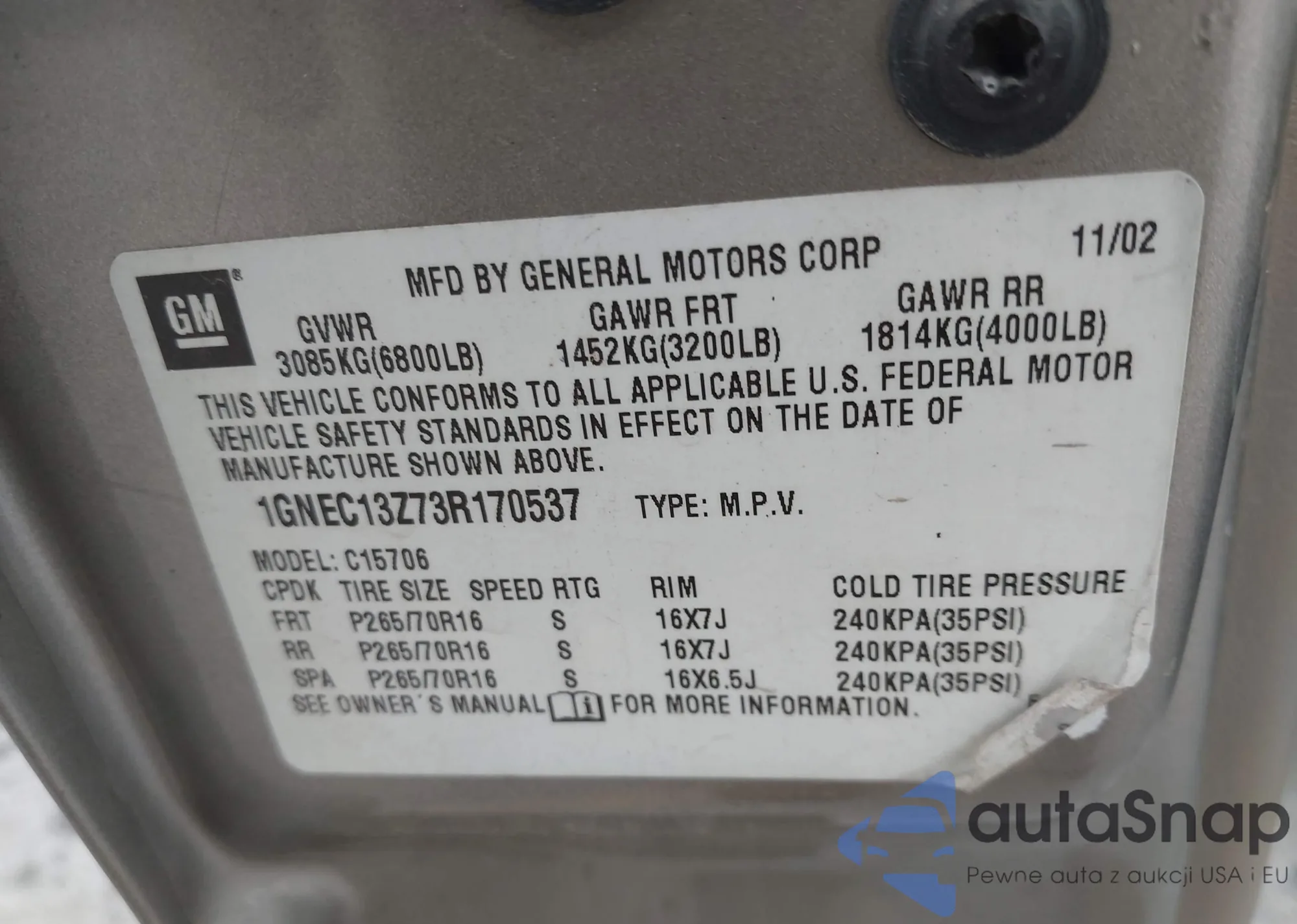 LOT: 43705437 VIN: 1GNEC13Z73R170537