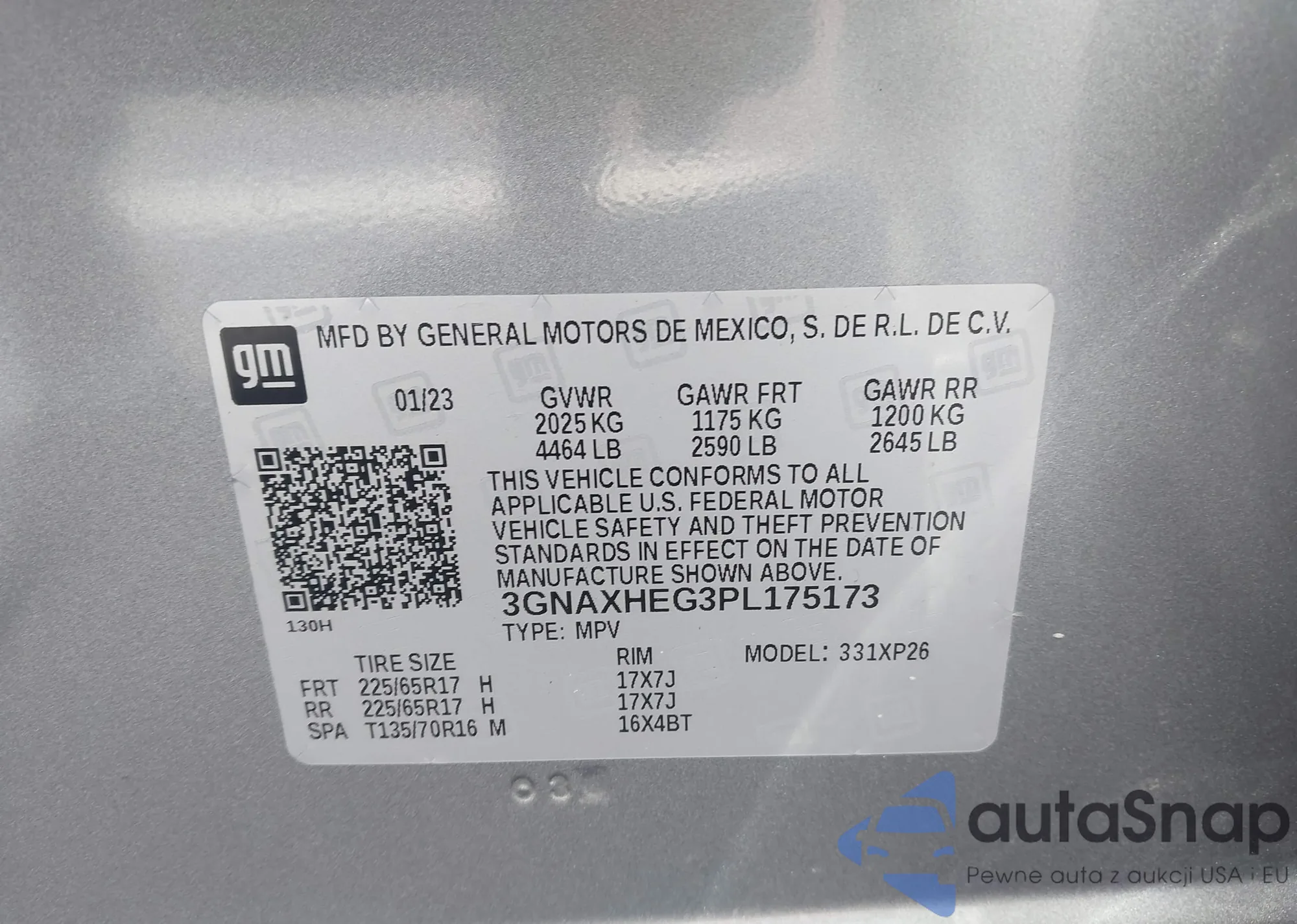 LOT: 43170403 VIN: 3GNAXHEG3PL175173