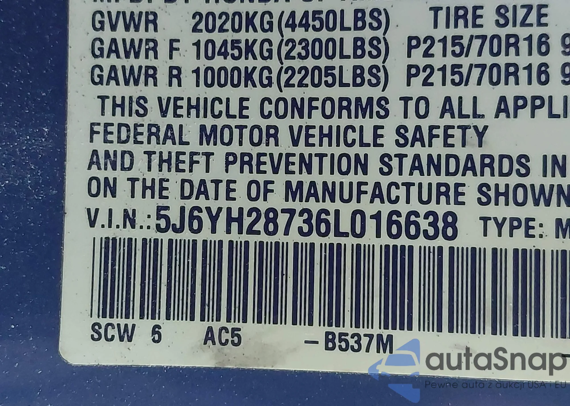 • VIN 5J6YH28736L016638