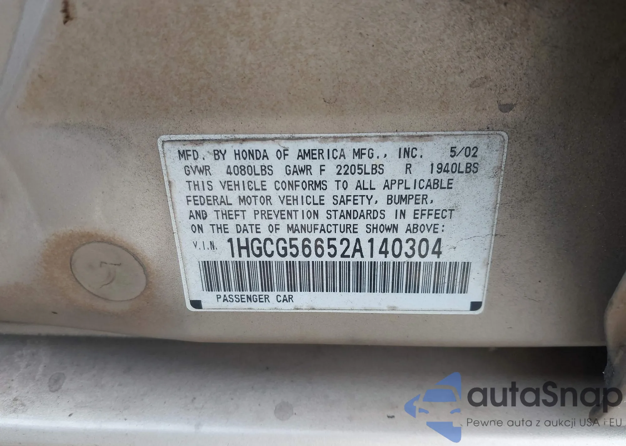 LOT: 43726224 VIN: 1HGCG56652A140304
