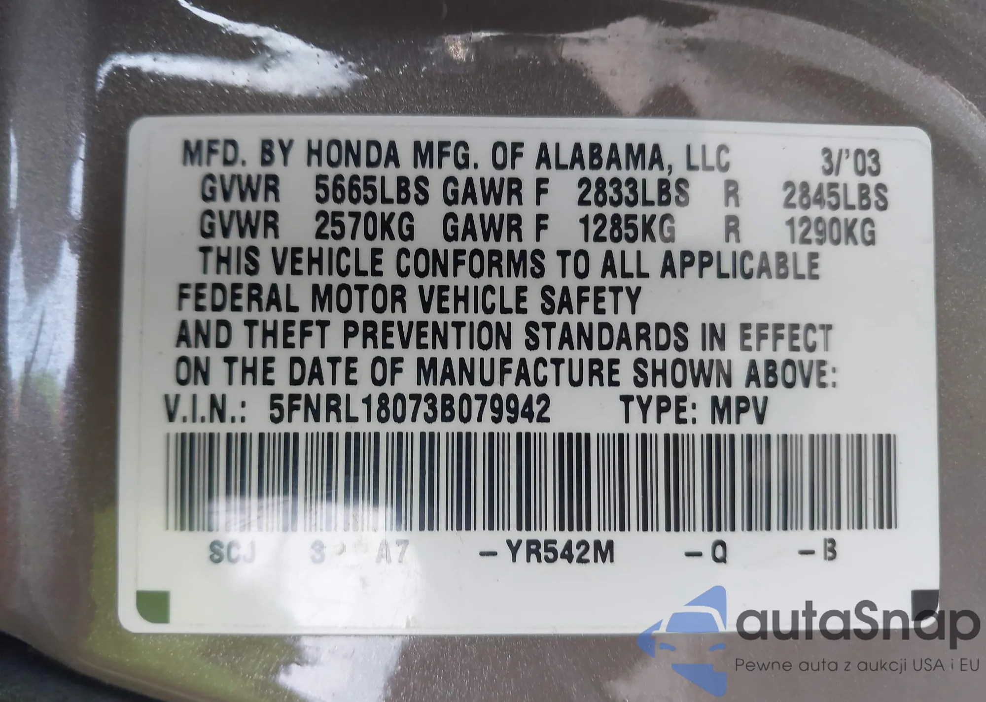 LOT: 43732253 VIN: 5FNRL18073B079942