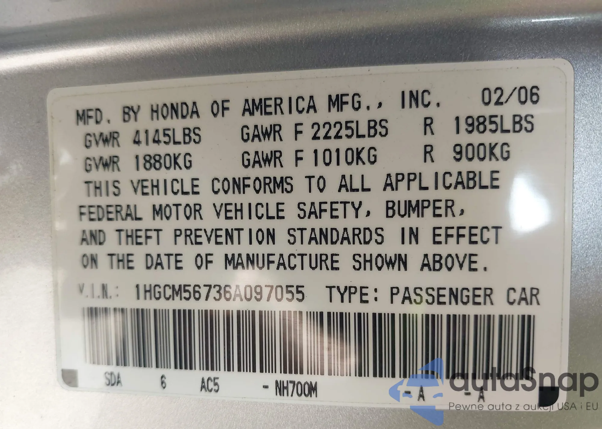 LOT: 43253072 VIN: 1HGCM56736A097055