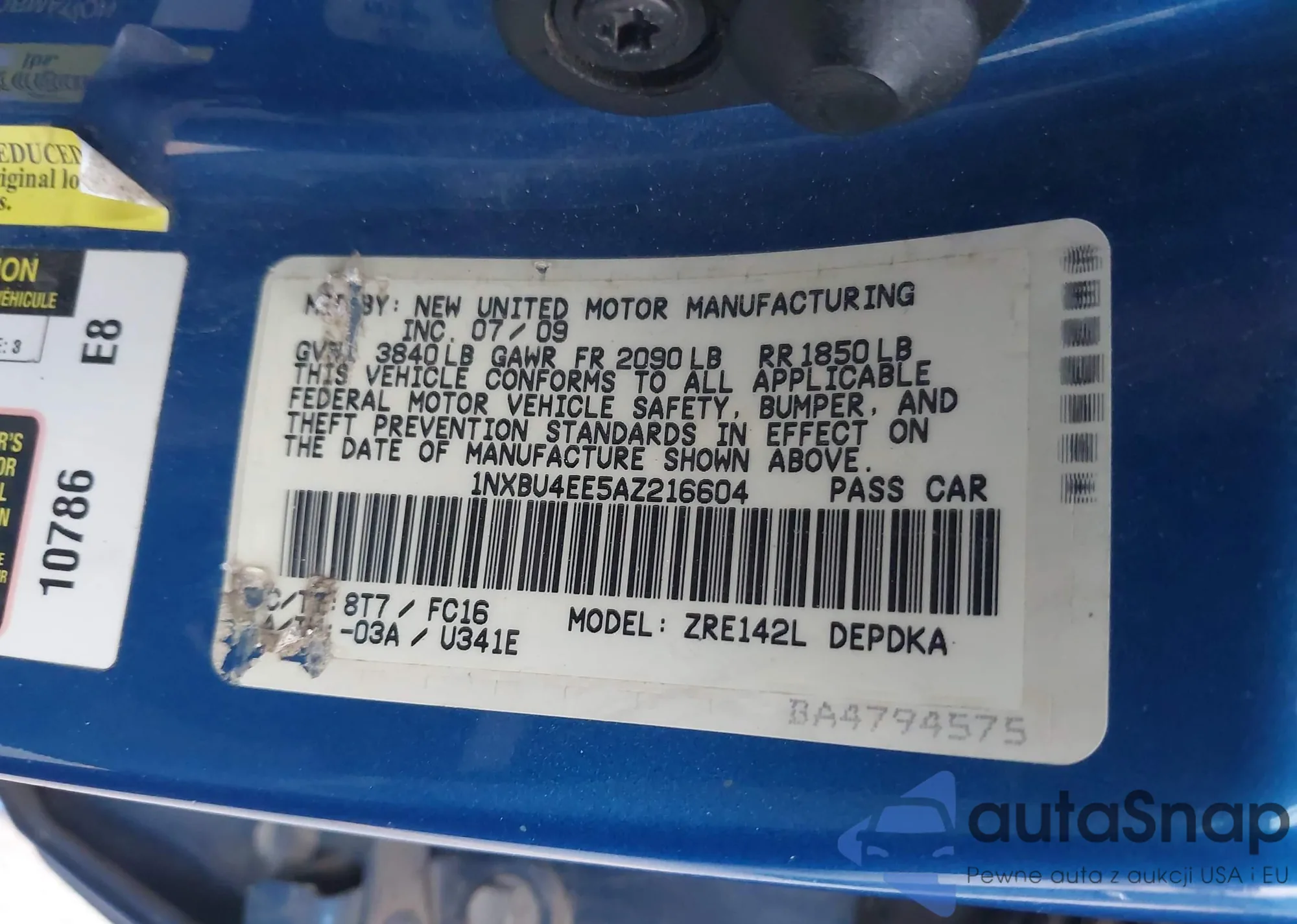 • VIN 1NXBU4EE5AZ216604