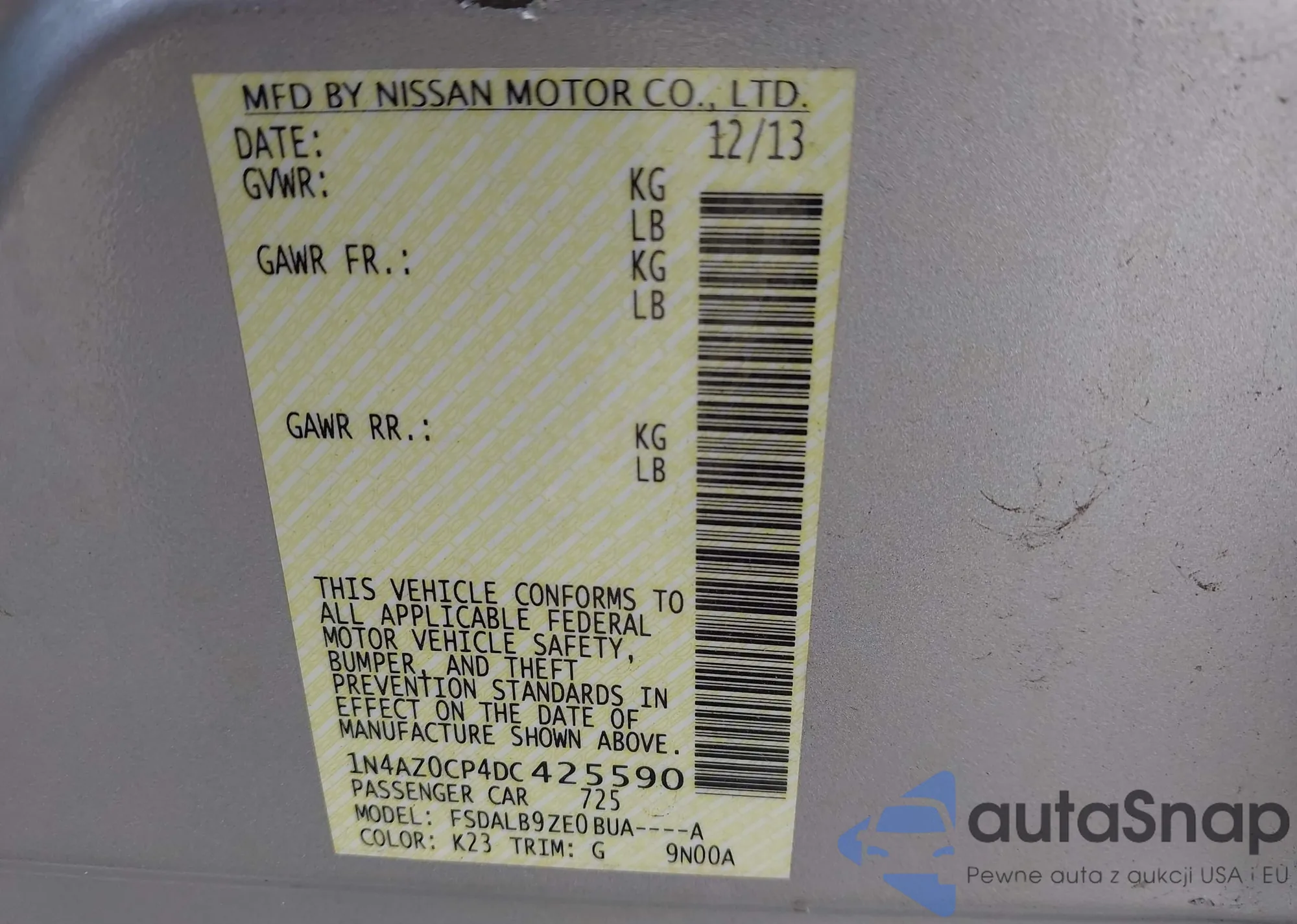 LOT: 43786223 VIN: 1N4AZ0CP4DC425590