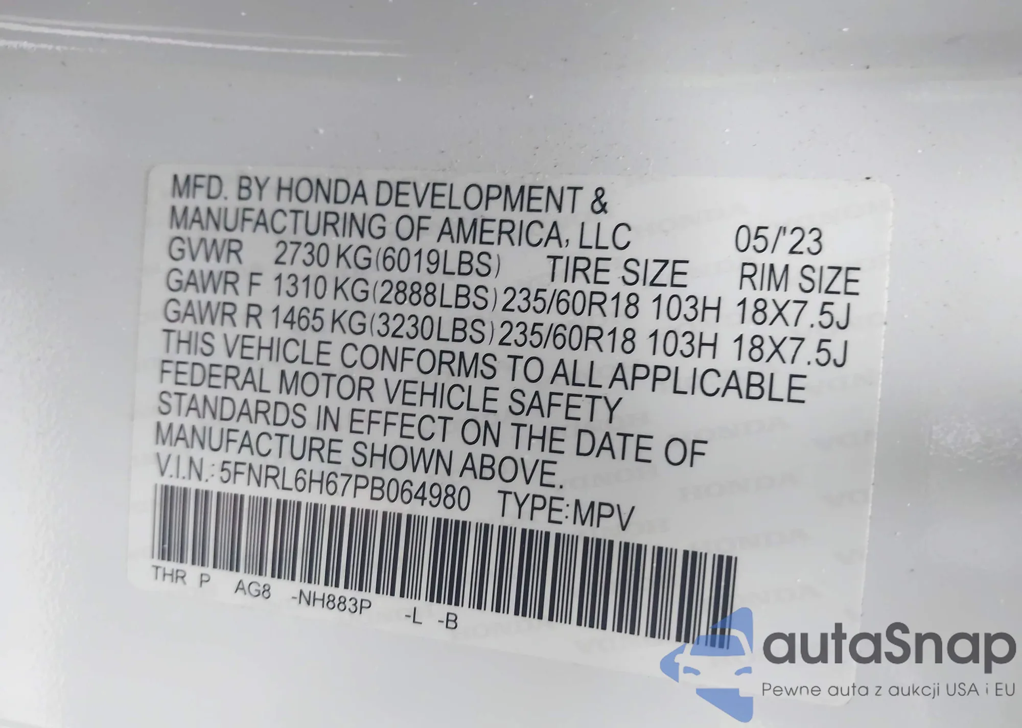 LOT: 43564967 VIN: 5FNRL6H67PB064980