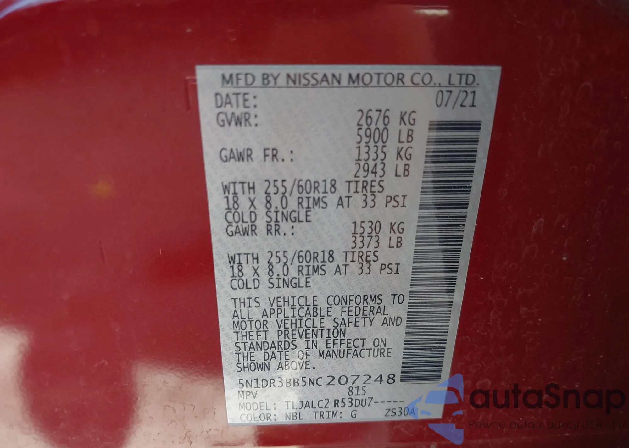 • VIN 5N1DR3BB5NC207248