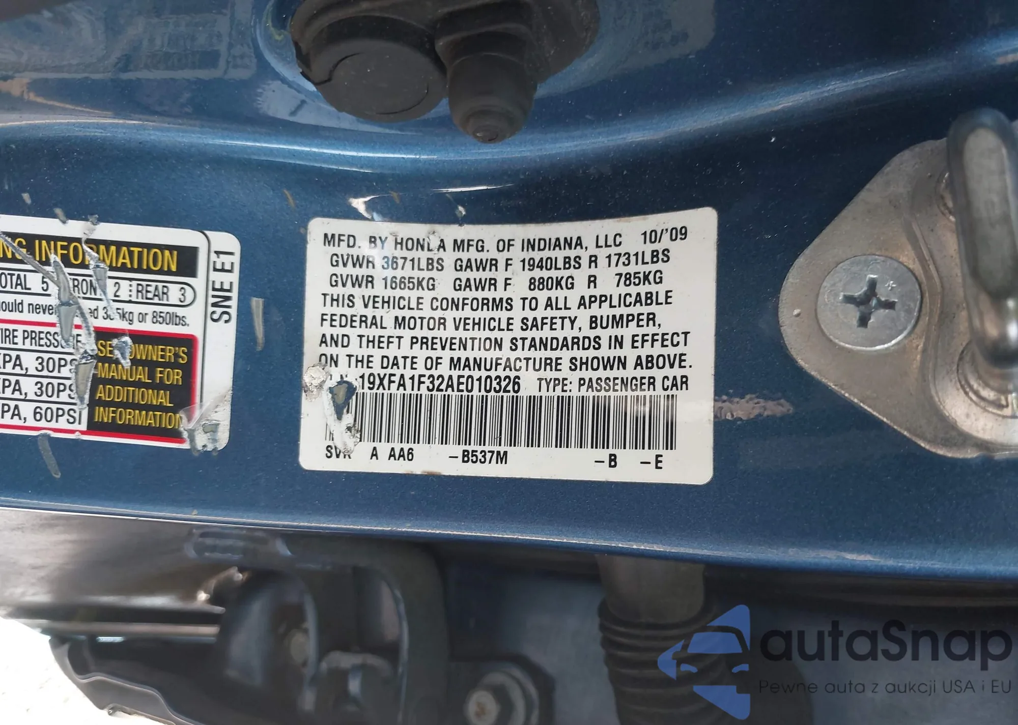 LOT: 43694127 VIN: 1HGCP2F31CA089244