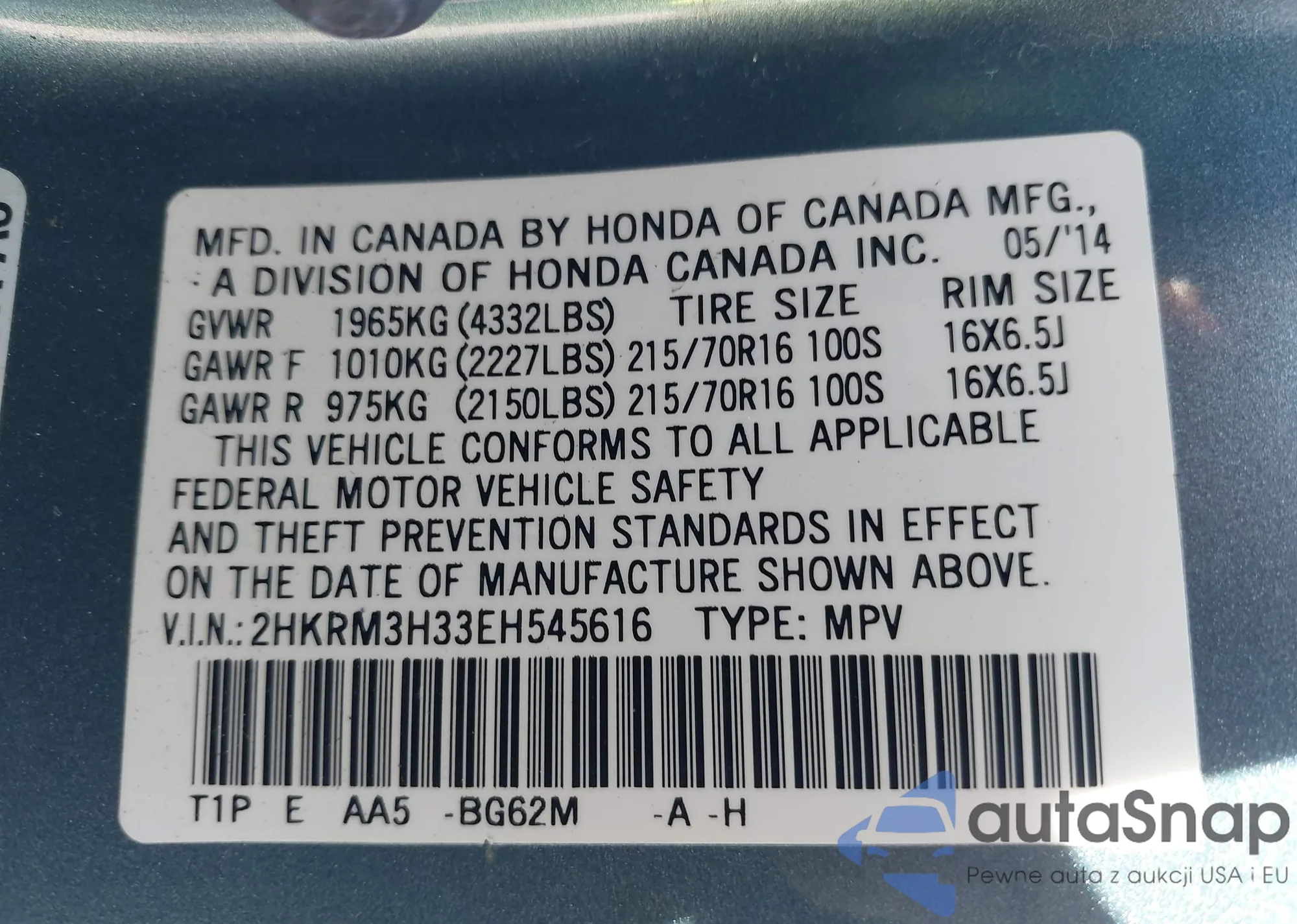 LOT: 43818557 VIN: 2HKYF18493H542591