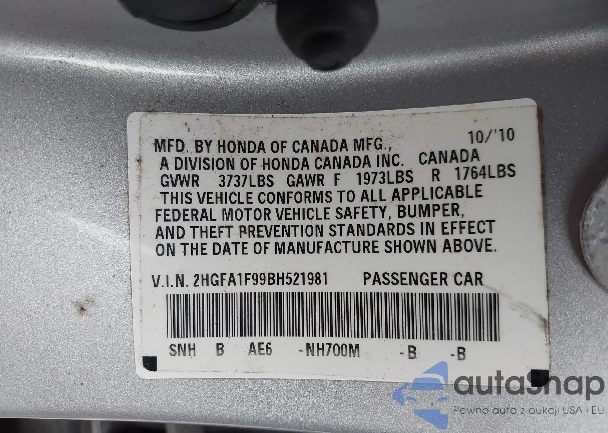 • VIN 2HGFA1F99BH521981