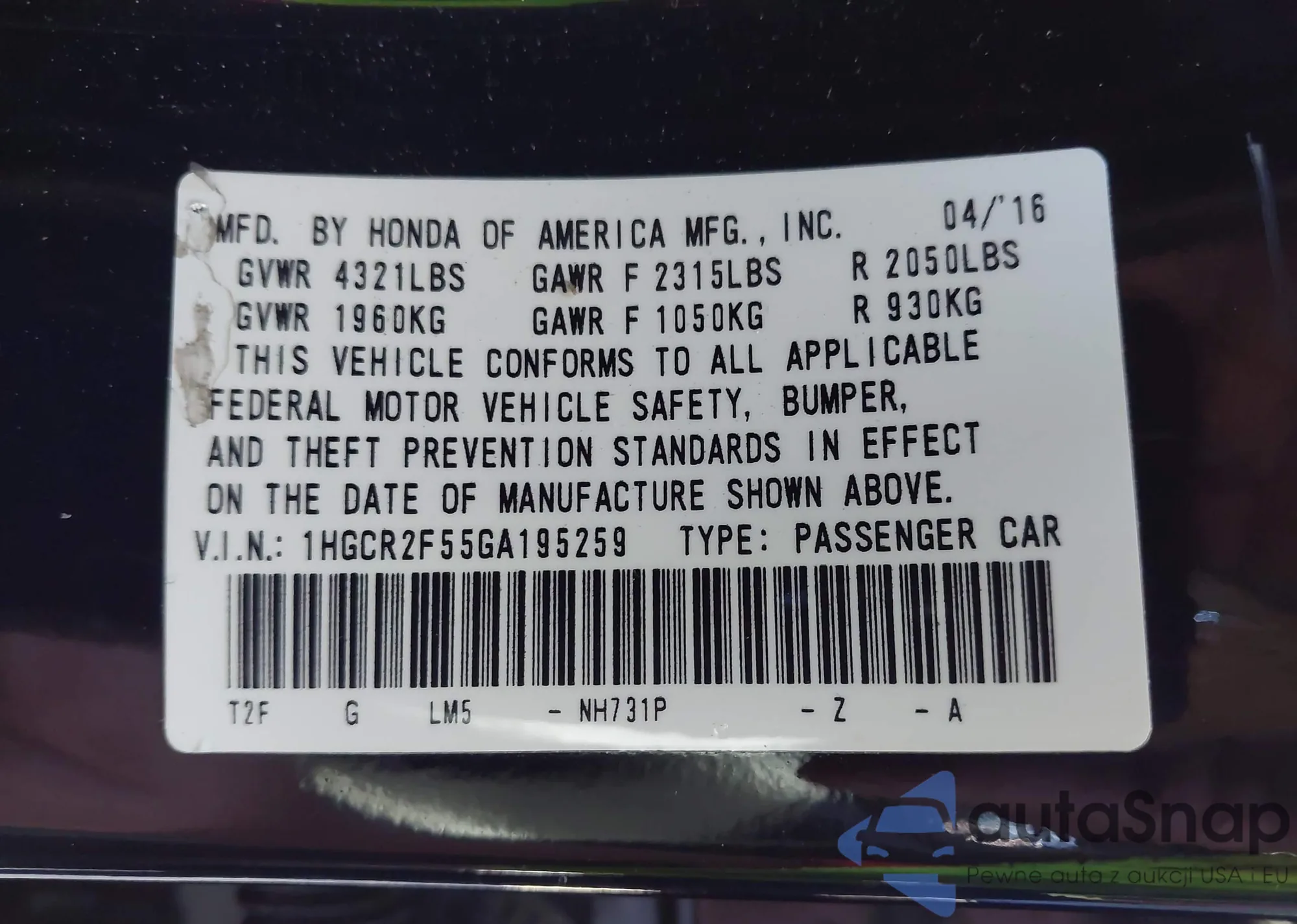 LOT: 43770259 VIN: 1HGCR2F55GA195259
