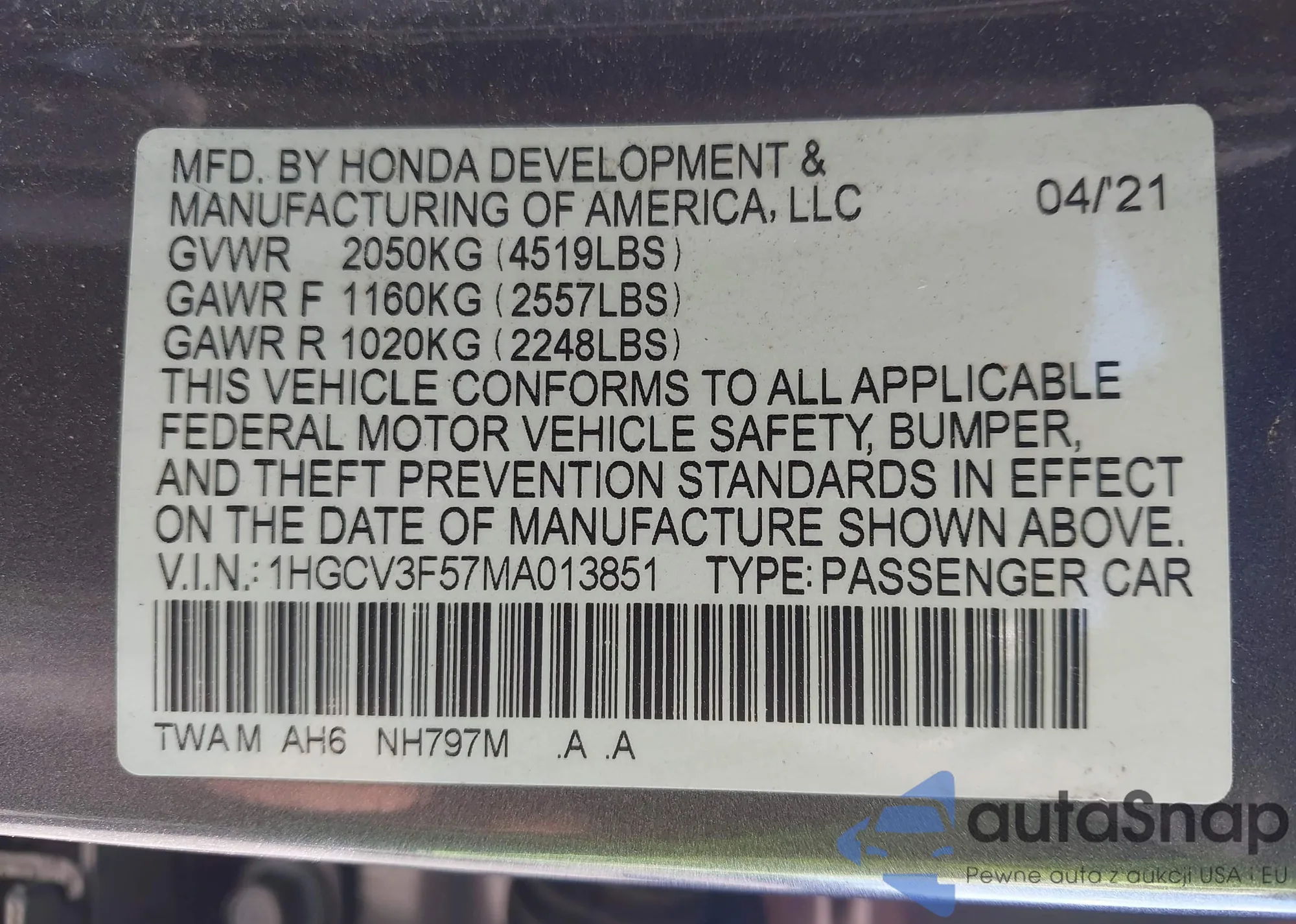 LOT: 43459457 VIN: 1HGCV3F57MA013851