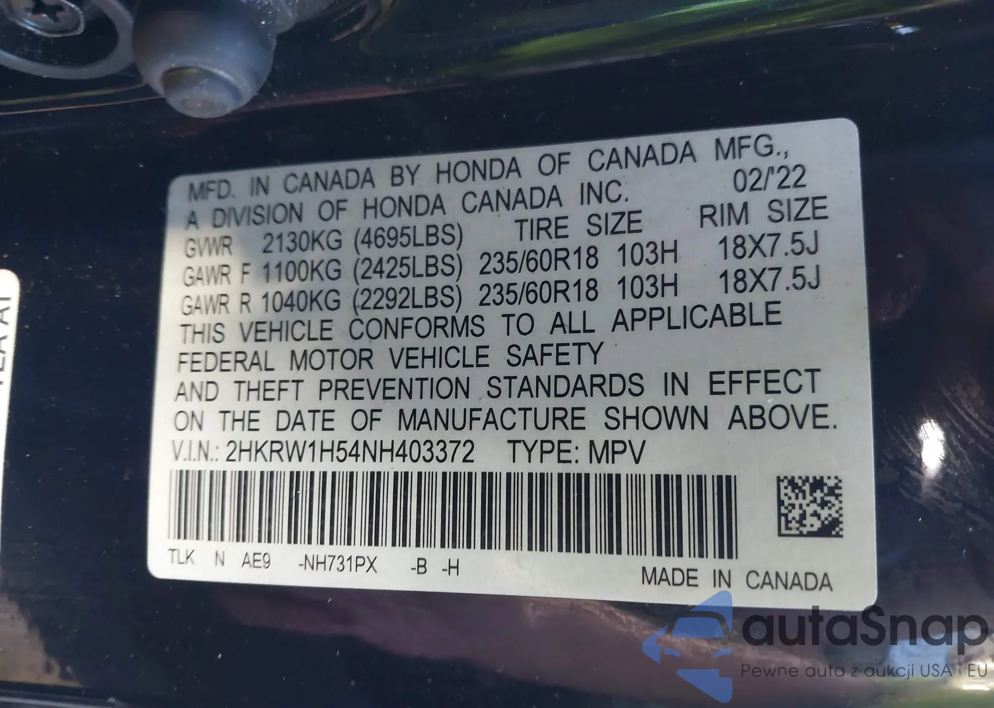 • VIN 2HKRW1H54NH403372