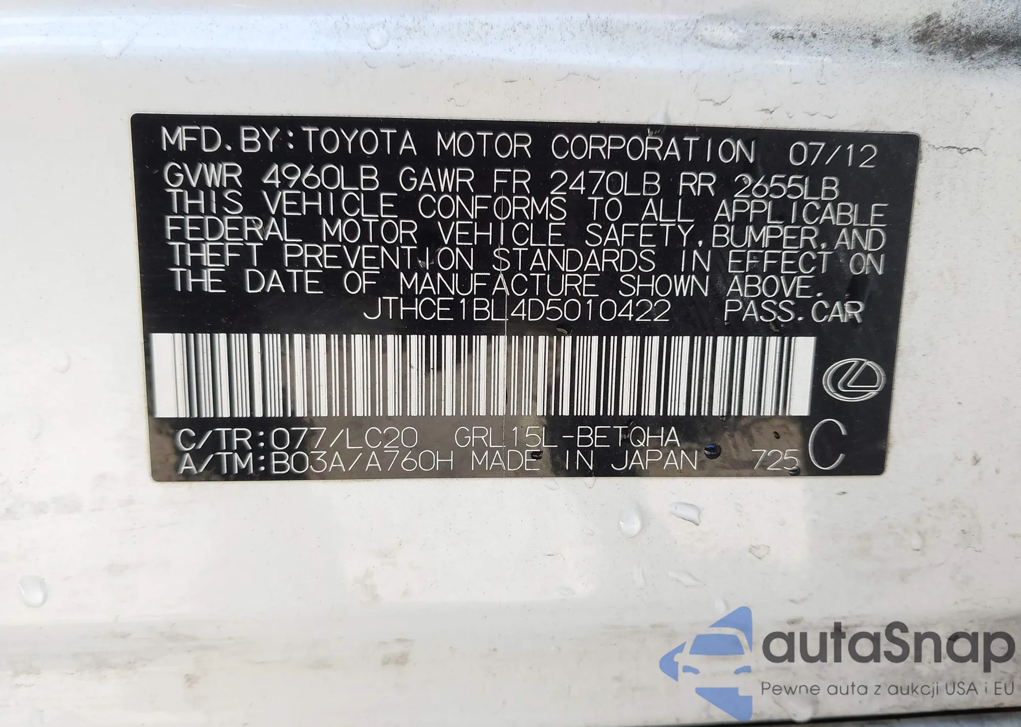 LOT: 43674878 VIN: JTHCE1BL4D5010422