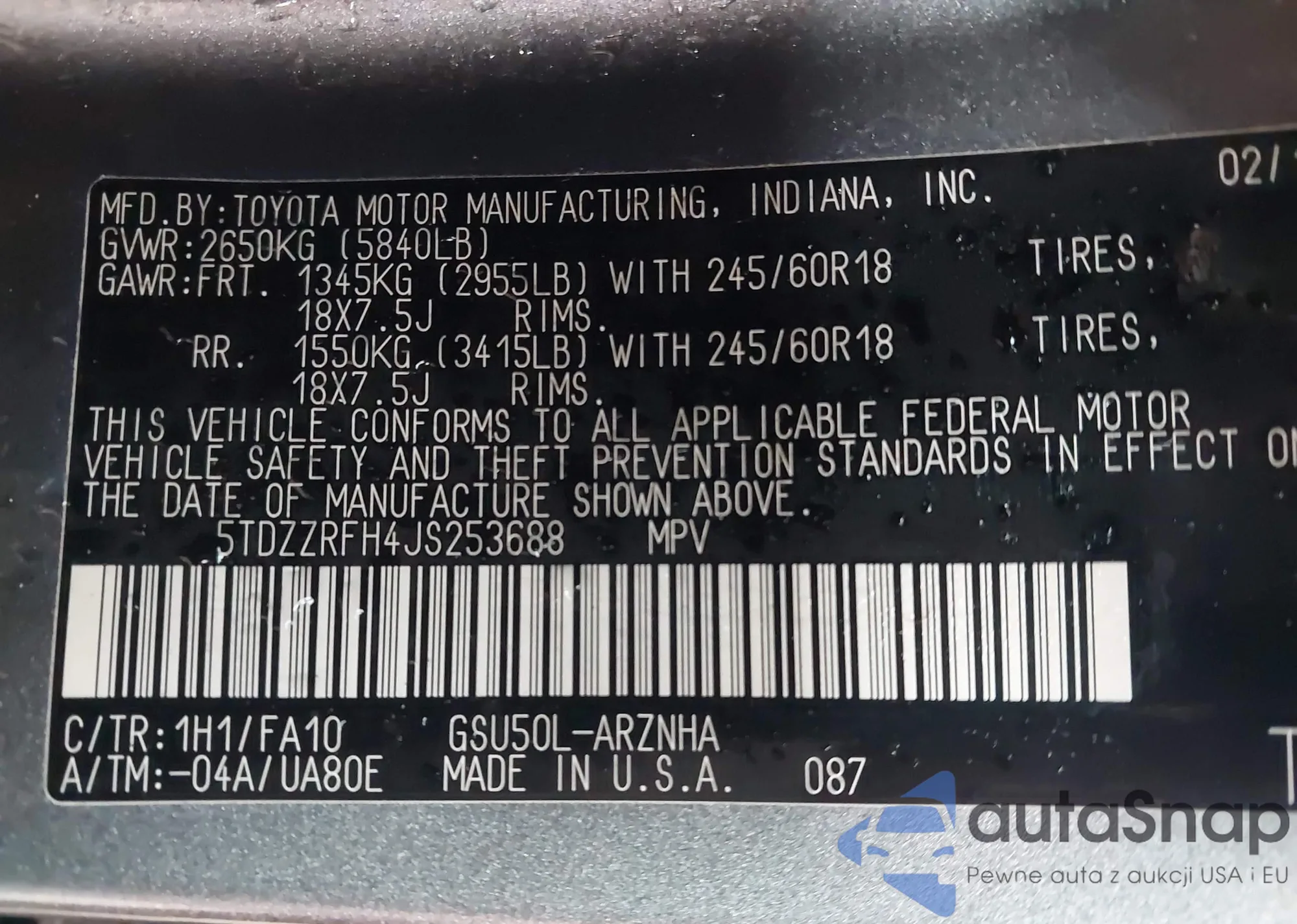 LOT: 43646628 VIN: 5TDZZRFH4JS253688