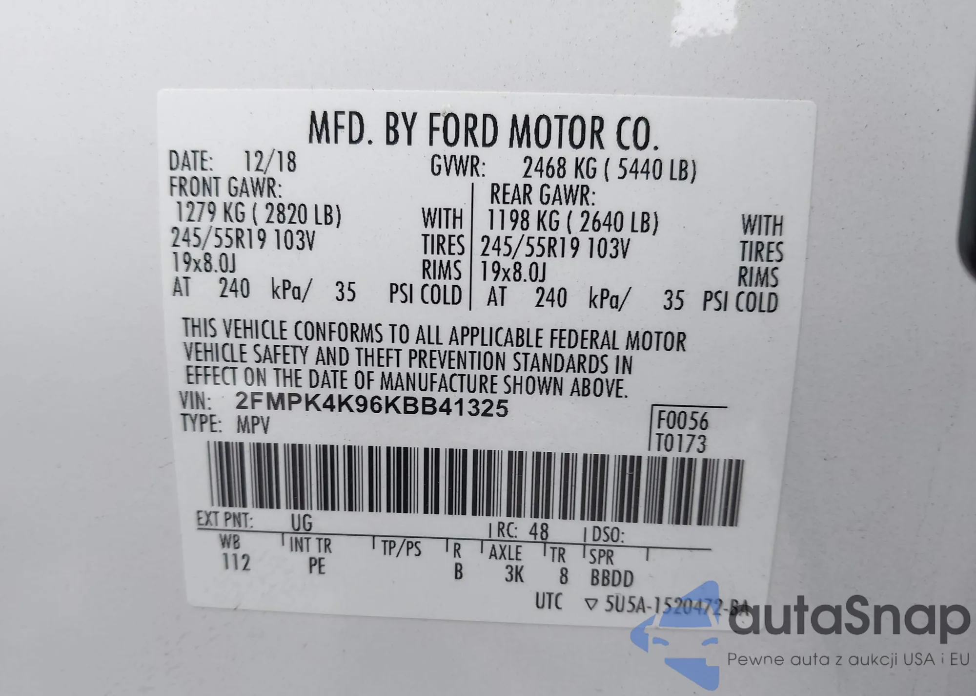 LOT: 43685686 VIN: 1FMCU9EG7BKC63603