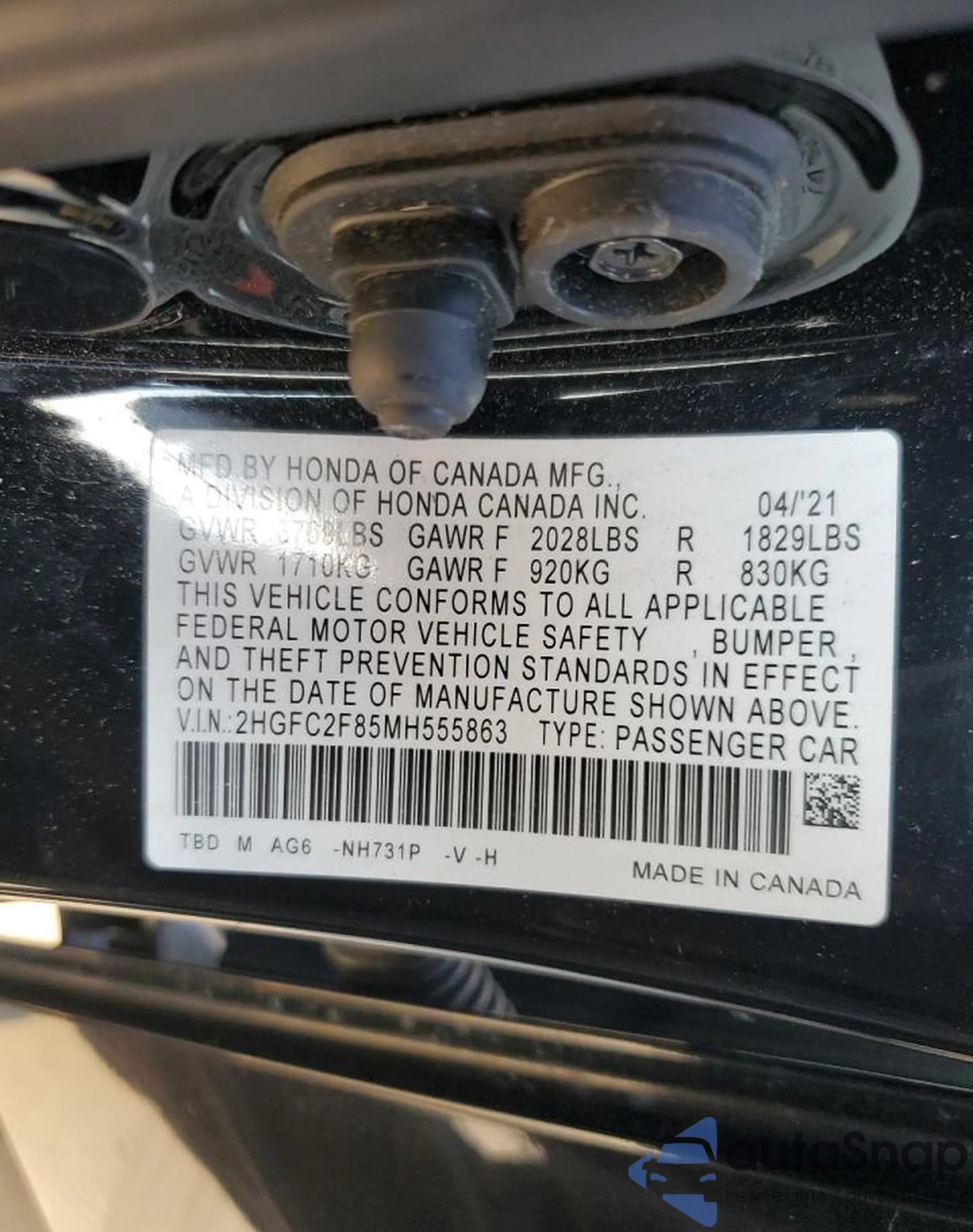 LOT: 81027505 VIN: 2HGFC2F85MH555863