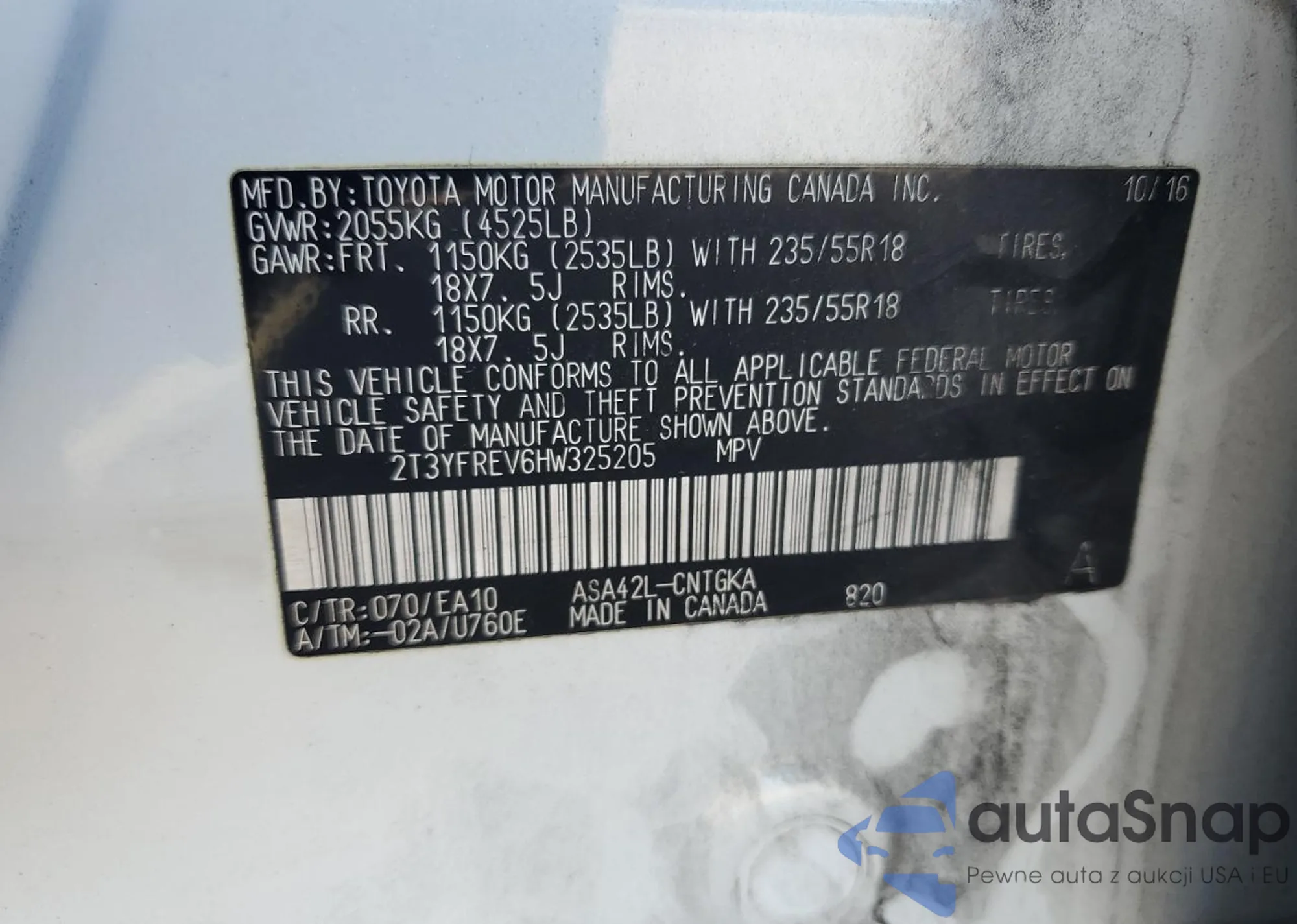 • VIN 2T3YFREV6HW325205
